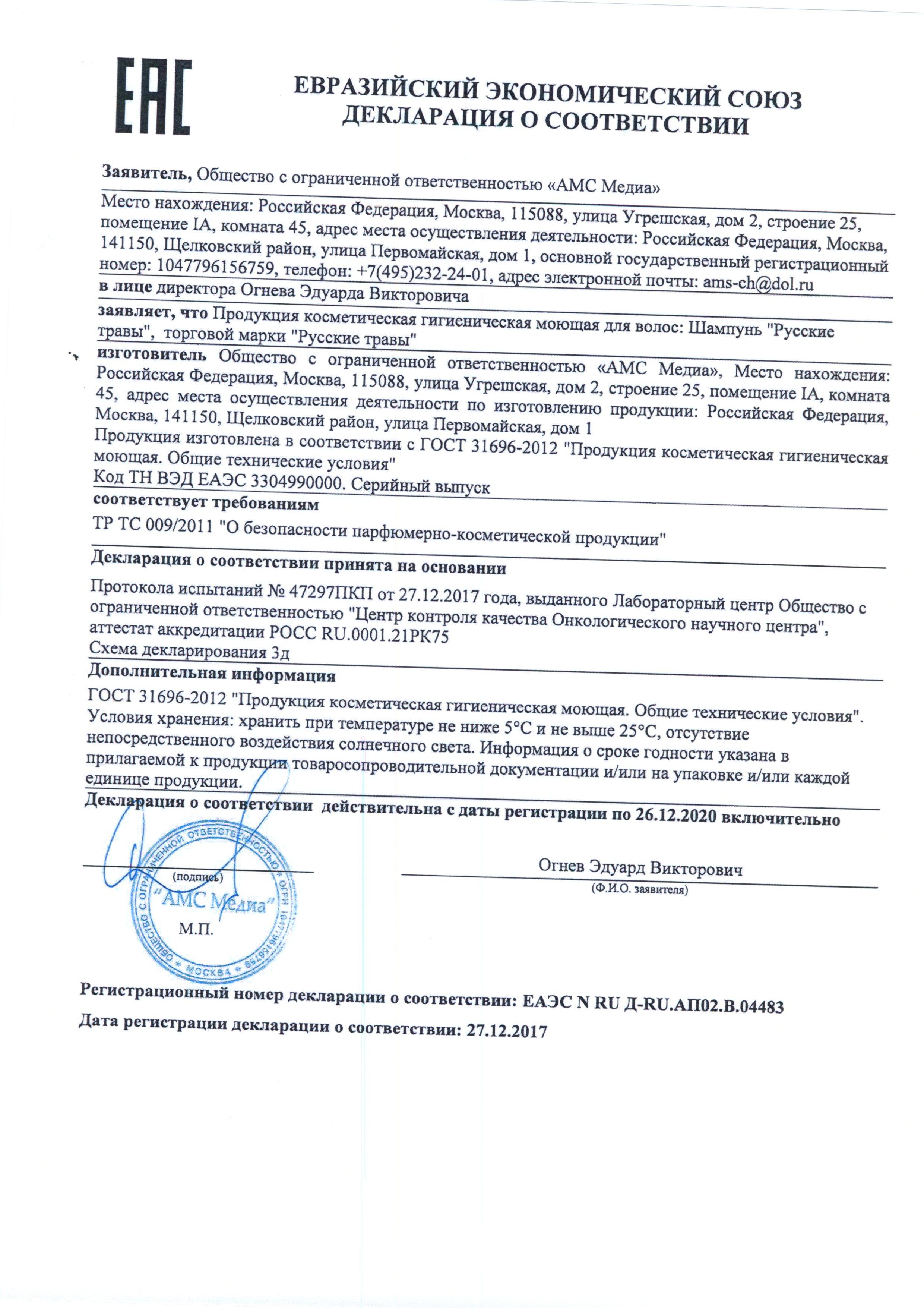 Шампунь для всех типов волос серии Русские травы предназначен для частого и ежедневного применения. Мягкая формула шампуня позволяет бережно очистить волосы и кожу головы, улучшить их состояние. Ароматическая композиция цветущих трав успокаивает и улучшает настроение. Шампунь нетоксичен, относится к категории биоразлагаемых, чувствителен к высоким и низким температурам (допускается изменение вязкости). Допускается хранение при низких температурах, после размораживания полностью восстанавливает свои