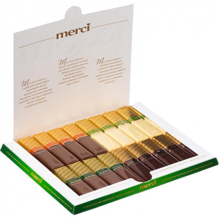 Шоколадные конфеты Merci ассорти c миндалём 250 г — это 4 изысканных вида шоколада с миндалем. Лесной орех и миндаль. Белый шоколад с хрустящим миндалем. Темный