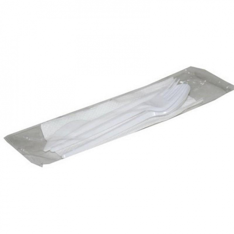 Набор одноразовой посуды включает в себя 4 предмета. В него входит: вилка, столовая ложка, нож и салфетка. В упаковке 50 наборов.