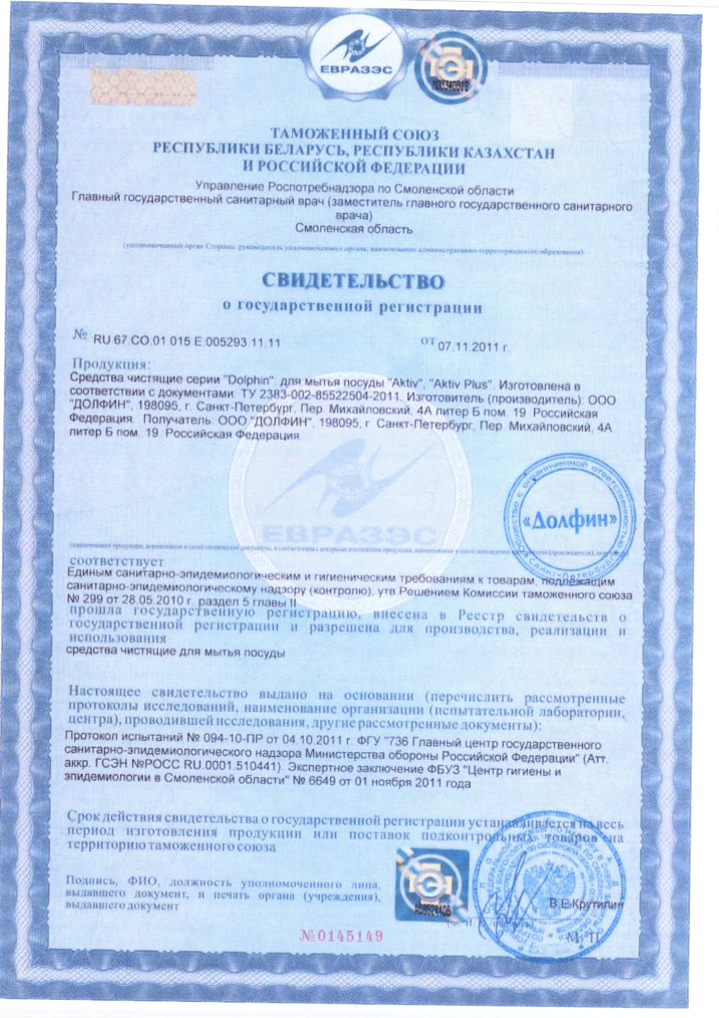 Сертификат на товар - Средство для ручного мытья посуды Dolphin Aktiv 1 л (концентрат)
