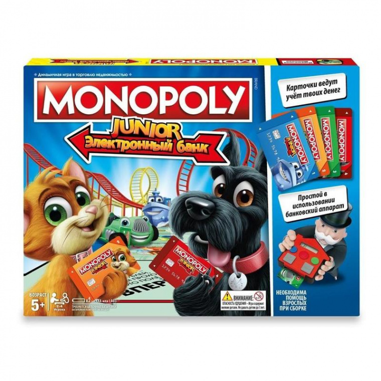 Игра настольная «Монополия Джуниор» с банковскими картами. Версия всемирно известной классической игры Монополия для детей от 5 лет. Дети становятся владельцами музея, магазина игрушек, кондитерской и других мест, которые так привлекают детей, а также в процессе игры расплачиваются банковскими картами. Количество игроков: 2-4. Упаковка: картонная коробка. Размер упаковки: 355×270×40 мм.