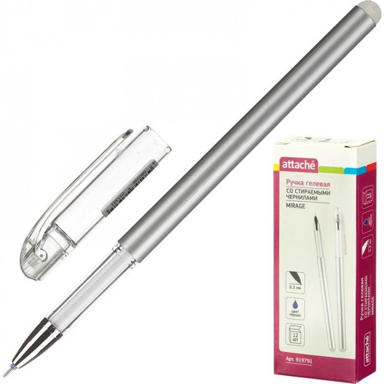 Ручка гелевая Attache со стираемыми чернилами синего цвета обладает игольчатым наконечником, обеспечивающим толщину линии письма 0,38 мм. Термочувствительные чернила становятся невидимыми при нагревании. Для удаления надписи необходимо потереть её специальным ластиком, встроенным в основание тыльной части ручки. При письме и стирании ручка не повреждает структуру бумаги, делая исправления незаметными. Ручка не рекомендована для использования в деловых документах. Диаметр шарика — 0,5 мм. Толщина линии письма — 0,38 мм. Длина ручки — 150 мм.