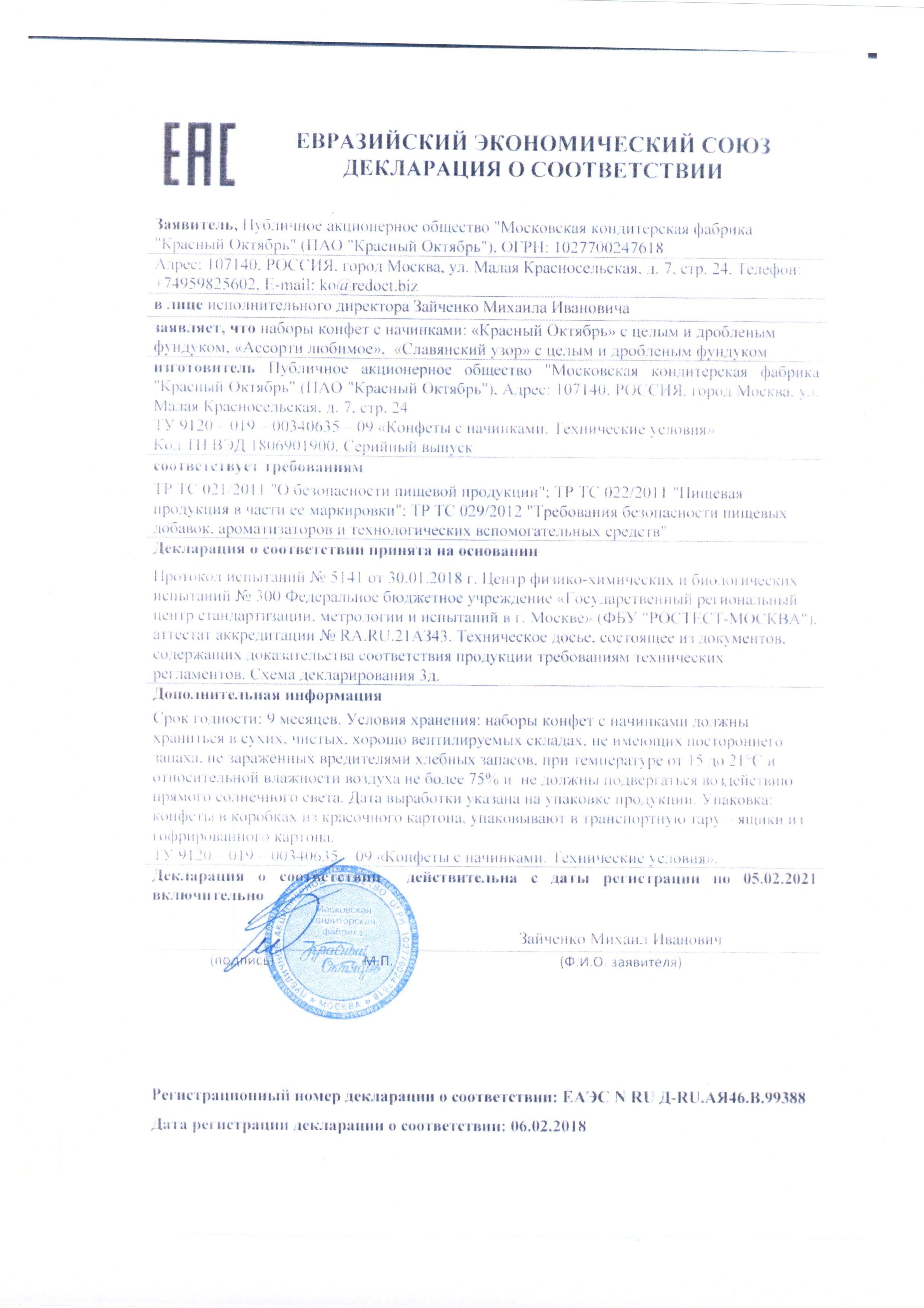 Состав: молочный шоколад (сахар, сухое цельное молоко, масло какао, какао тертое, эмульгаторы: лецитин соевый, эфиры полиглицерина и взаимоэтерифицированных рициноловых кислот, ароматизаторы), сахар, патока, сгущенное с сахаром молоко (цельное молоко, сахар), заменитель молочного жира (рафинированные, дезодорированные негидрогенизированные растительные масла: пальмовое масло, соевое масло, антиокислители: лецитин подсолнечника, аскорбилпальмитат, токоферолы, концентрат смеси, лимонная кислота), белый шоколад (сахар, масло какао, молоко сухое цельное, эмульгатор лецитин соевый, натуральная ваниль), влагоудерживающий агент сорбит, белок сухой яичный, желирующие агенты агар и пектин, концентрат молочного белка, ароматизаторы, соль, натуральные красители: кармин, экстракт паприки; эмульгаторы: моно- и диглицериды жирных кислот, эфиры полиглицерина и жирных кислот, сорбат калия.