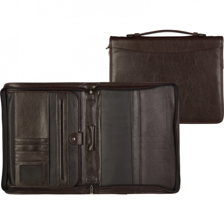 Комбинированная папка, изготовлена из двух видов кожзама. По периметру застегивается на молнию. Удобная ручка позволяет носить папку как портфель. Внутри папки есть откидное отделение, которое крепится кнопкой.
