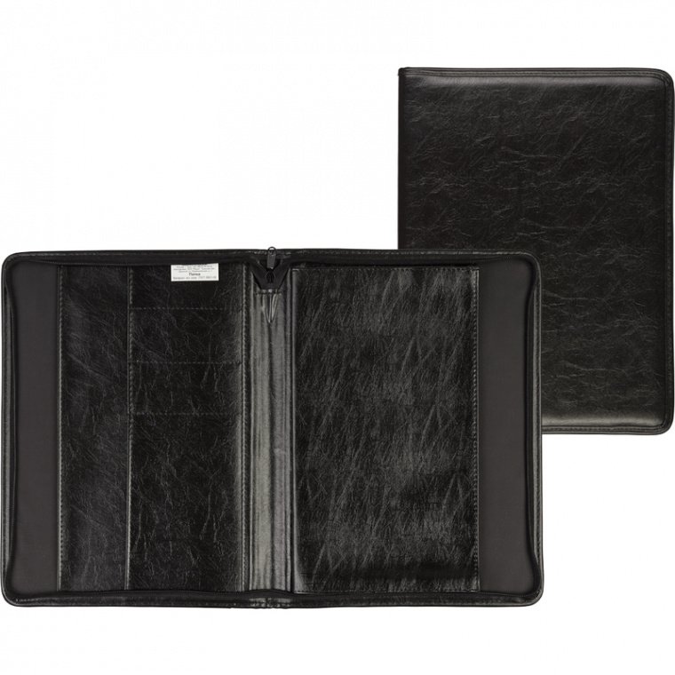 Папка Выбор № 149 с ручкой. Материал — искусственная кожа. Закрывается на молнию. Внутри карманы для документов формата А4, а также система карманов для визиток и других мелких документов. Корешок папки (толщина) — 2 см. Размеры: 34×27 см.