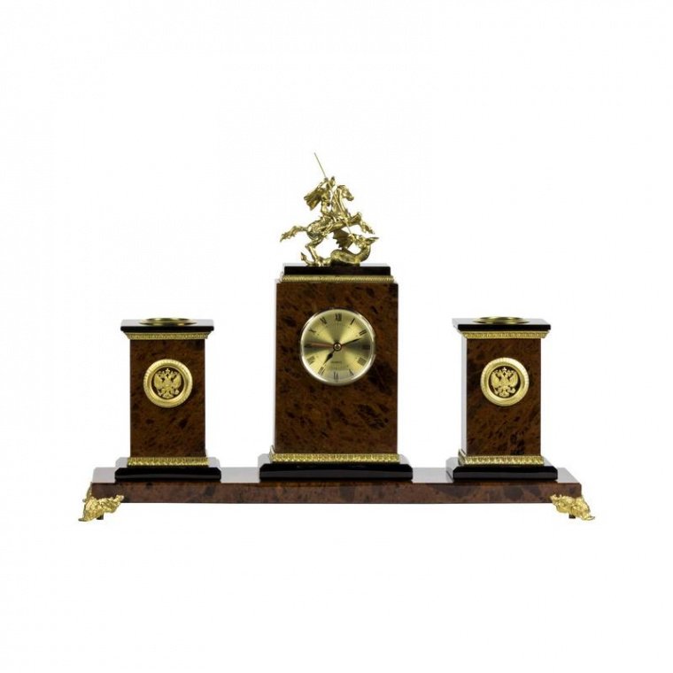 Настольный набор ’’Держава Россия’’ изготовлен из обсидиана, качественного природного камня благородного оттенка. В состав набора входят часы и две карандашницы на общей подставке. Детали дополнены и украшены литыми элементами из латуни — гербами России и Георгием Победоносцем, разработанными специально для данного набора. Размер набора: 43×12,5×31 см.