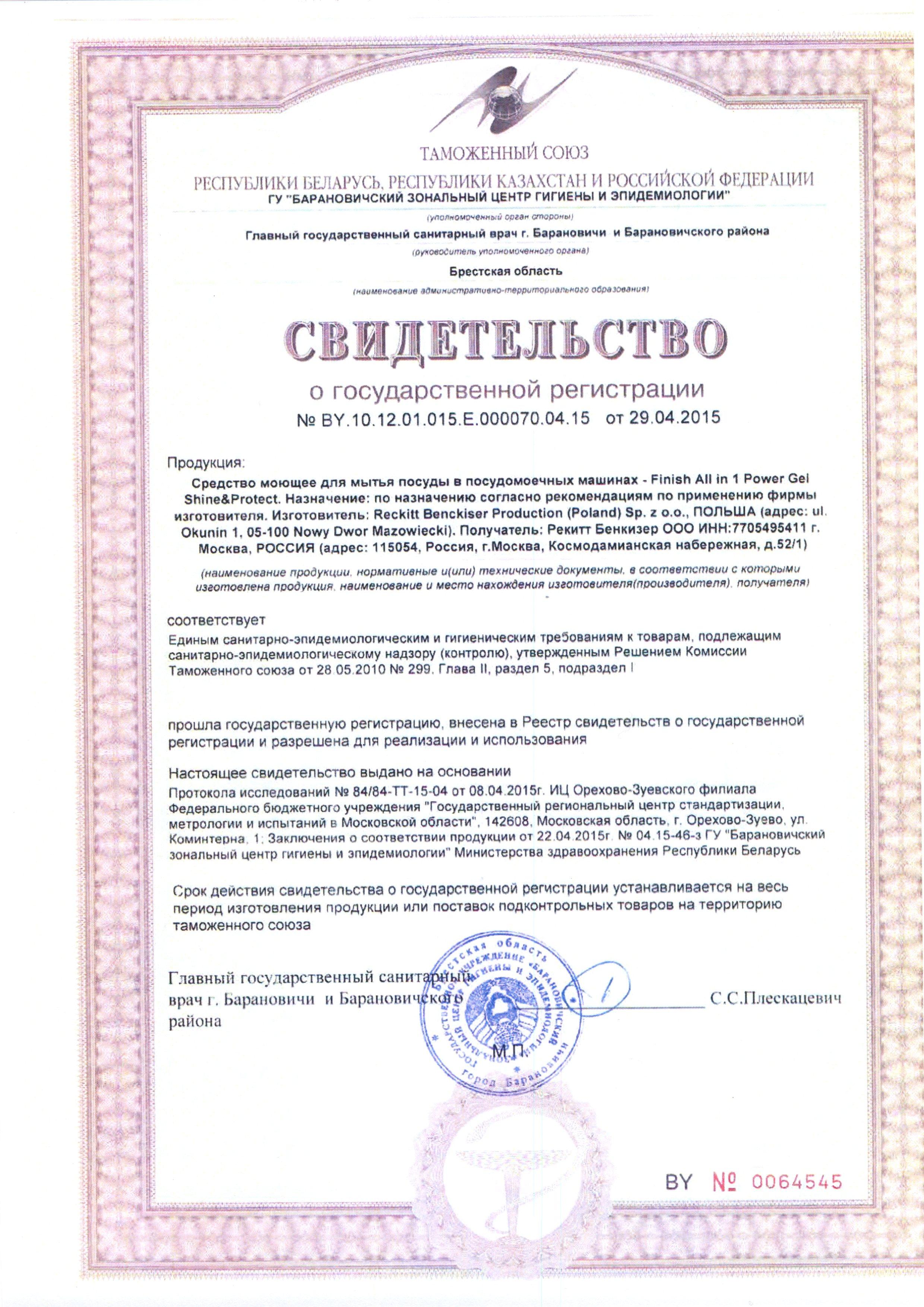 Сертификат на товар - Гель для посудомоечных машин Finish All in 1 1 л