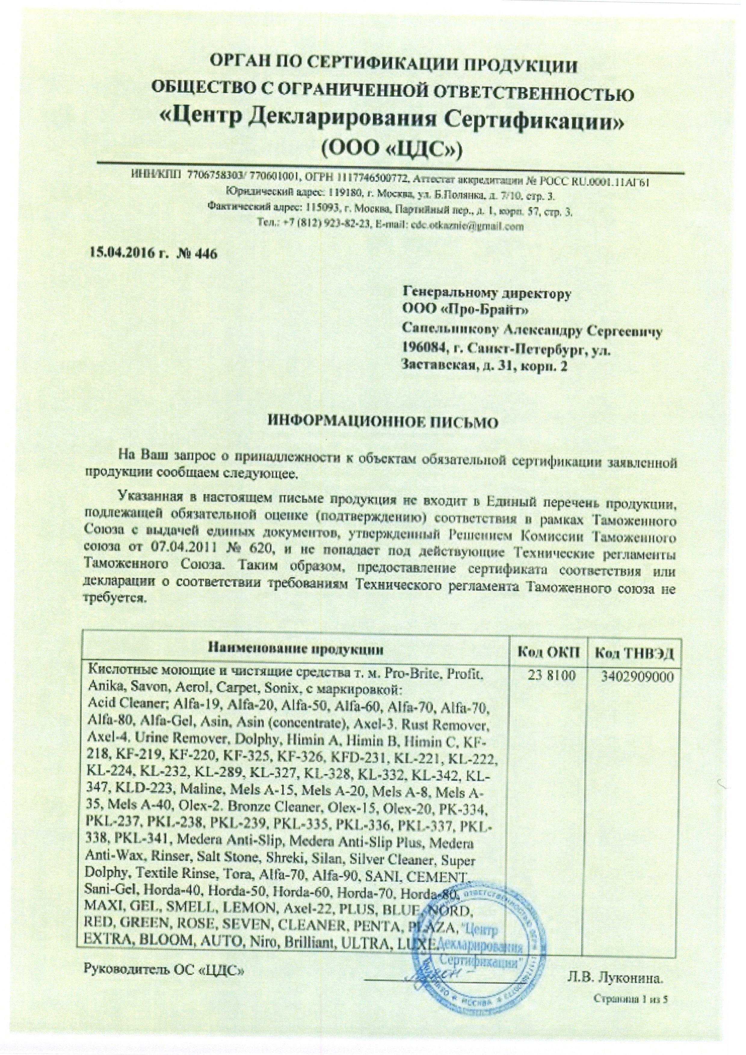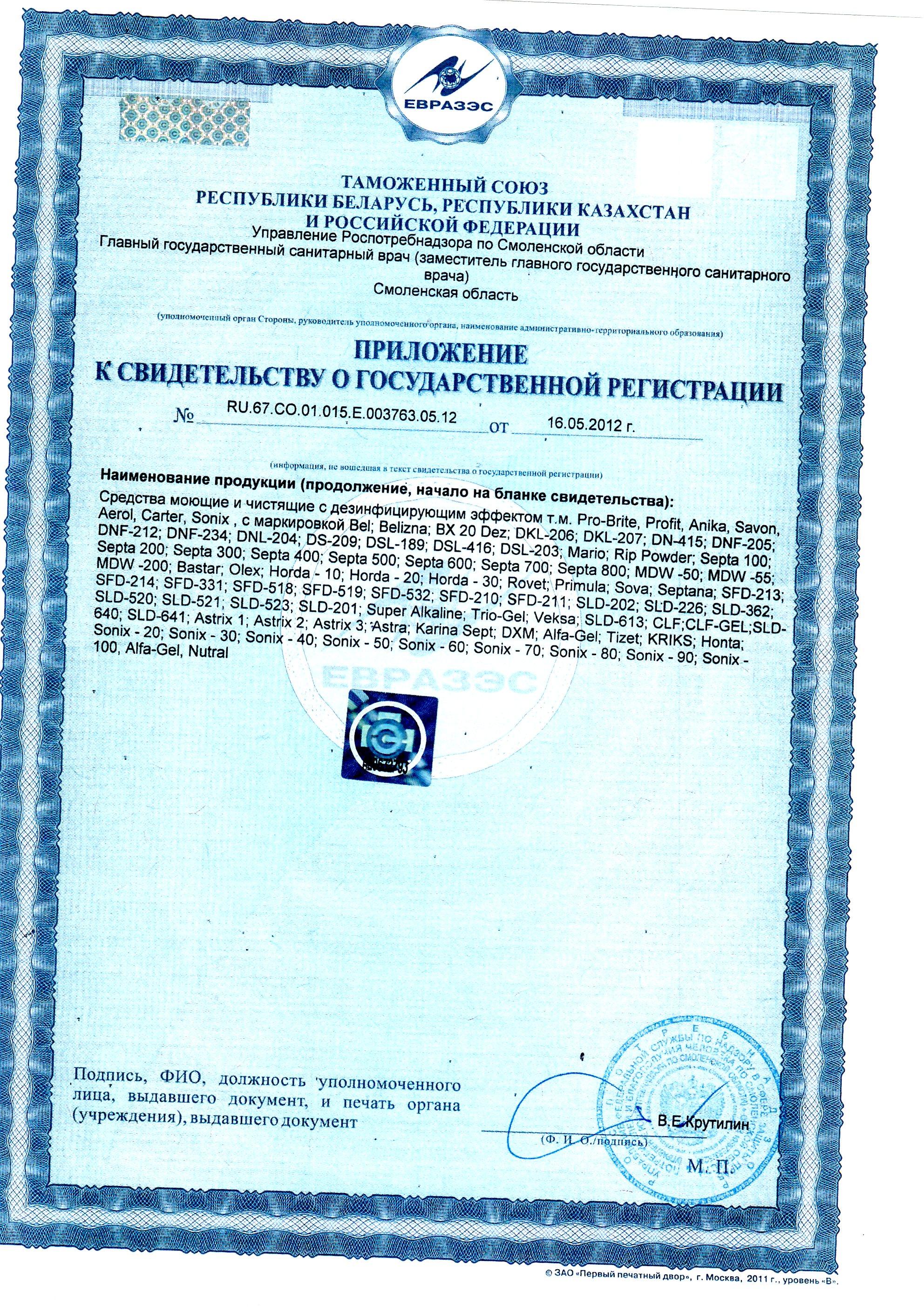 Сертификат на товар - Универсальное моющее средство с дезинфицирующим эффектом Pro-Brite Septa-200 5 л (концентрат)