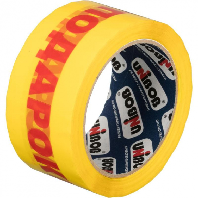 Клейкая лента упаковочная Unibob на полипропиленовой основе, плотностью 50 мкм, желтого цвета, с логотипом ’Подарок’, нанесенным красным цветом. Отличается высокой адгезией клея (слипанием с поверхностью), стойкостью к разрыву. Ширина ленты — 50 мм, длина намотки — 66 м, диаметр втулки — 76 мм. Клейкая лента предназначена для упаковки и маркировки товаров, к которым прилагается подарок, не теряет свойств на открытом воздухе при температуре от 10 до 30 градусов Цельсия.