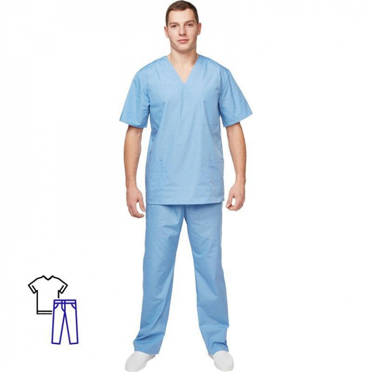 Костюм хирурга универсальный м05-КБР голубой (размер 44–46, рост 182–188) изготовлен из ткани голубого цвета, состав — 65% полиэфира и 35% хлопка. Плотность материала составляет 120 г/кв.м, благодаря чему обеспечивается легкость изделия. Ти-Си — материал, приятный на ощупь, гигиеничен и долговечен. Не мнется, легко и быстро стирается, быстро сохнет. Долго сохраняет свой первоначальный яркий цвет. Ткань «дышит», благодаря входящему в состав хлопку, имеет повышенный срок службы и проста в уходе, благодаря полиэфиру. Медицинский костюм состоит из куртки и брюк, подходит и для женщин, и для мужчин. Куртка с коротким рукавом и нагрудным карманом, свободный покрой обеспечивает удобство в работе. Брюки прямые на резинке. Униформа рекомендована для сферы красоты и здоровья: медицинские учреждения, центры. Соответствует ГОСТ 9897–88