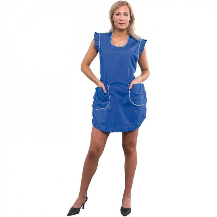 Фартук для торговли всеразмерный. Изготовлен из ткани василькового цвета, состоящей из 23% хлопка и 77% полиэфира. Плотность ткани — 120 г/кв.м. Фартук имеет накладные карманы и эластичную тесьму для регулировки талии, спина открыта.