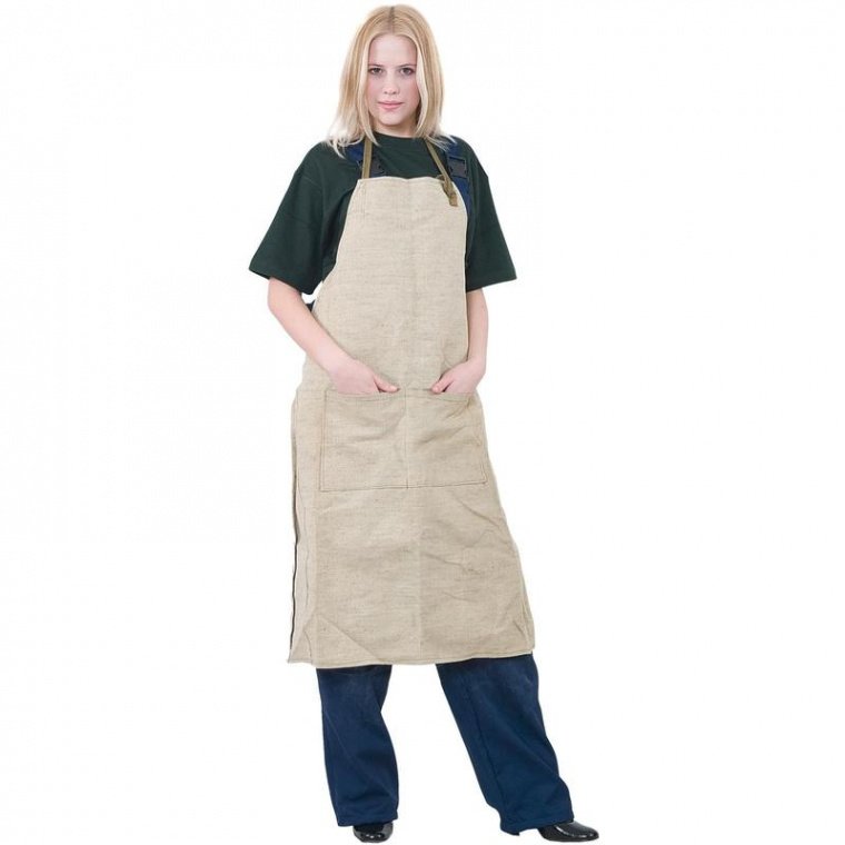 Фартук с цельнокроеным нагрудником и притачанной к боковым углам на уровне талии тесьмой для завязывания. Фартук цвета хаки предназначен для защиты при работе с грубыми материалами. Ткань — брезент (100% парусина). Длина фартука: 103-104 см. Длина завязок: 50 см. Ширина фартука по талии, где завязки: 75 см. Ширина низа фартука: 96 см. Тип А — фартук защищает передний участок тела работника.