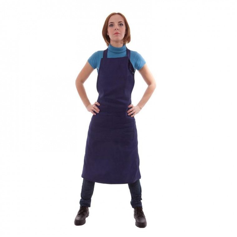Фартук с цельнокроеным нагрудником и накладными карманом, к боковым углам на уровне талии притачана тесьма для завязывания. Ткань: Диагональ (состав: 100% хлопок). Тип А — фартук защищает передний участок тела работника.
