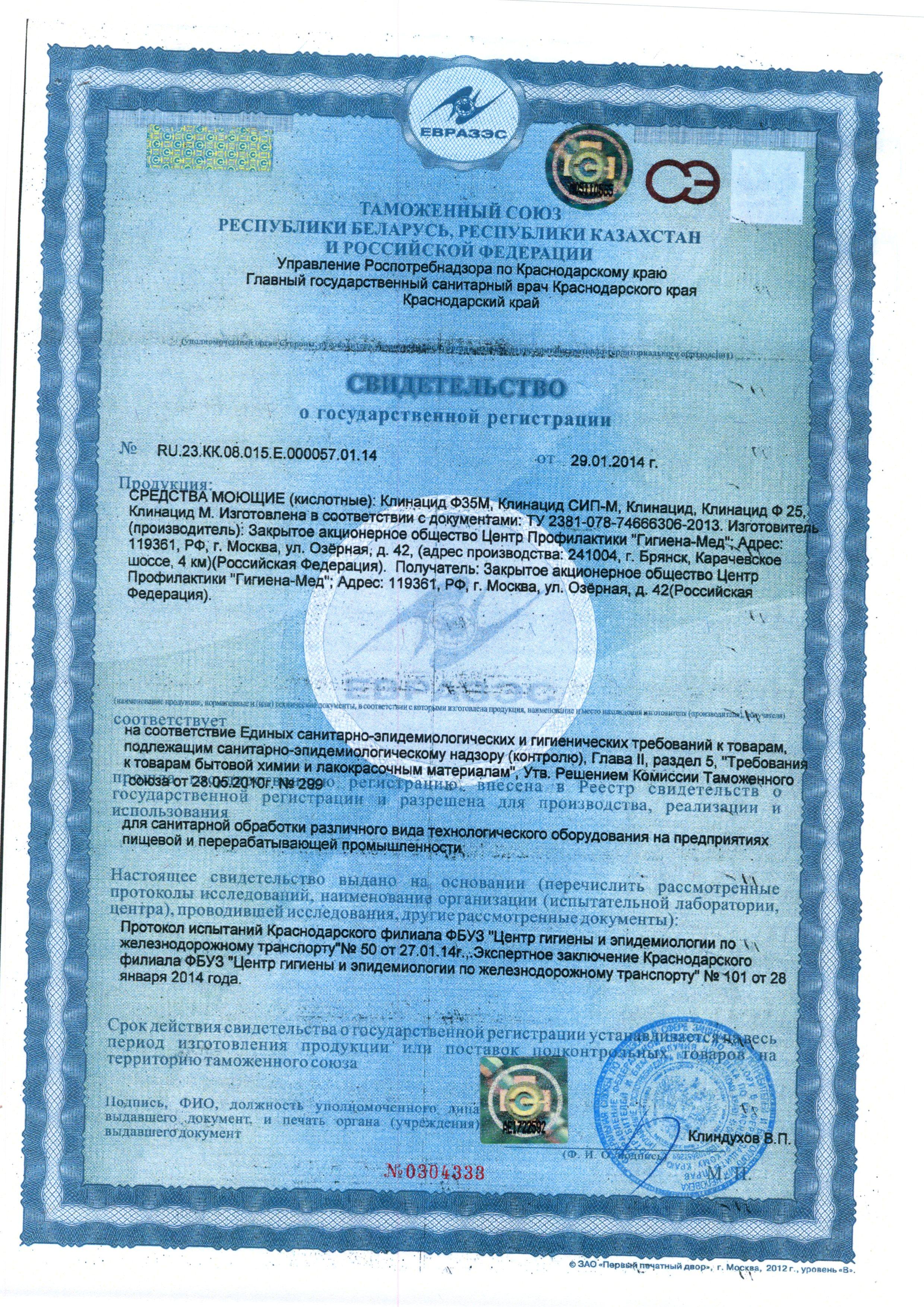 Сертификат на товар - Средство для мойки пищевого оборудования Клинацид ТМ 5 л (концентрат)