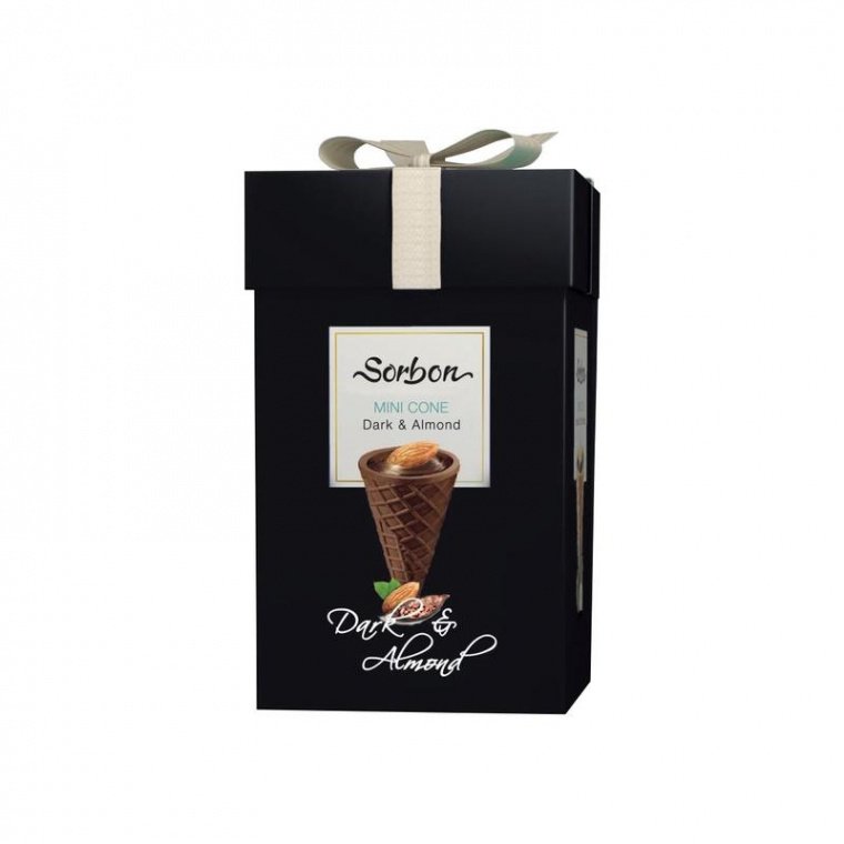Конфеты Sorbon Dark&Almond мини-рожки — это вкусное лакомство в хрустящем вафельном стаканчике с какаосодержащей начинкой.