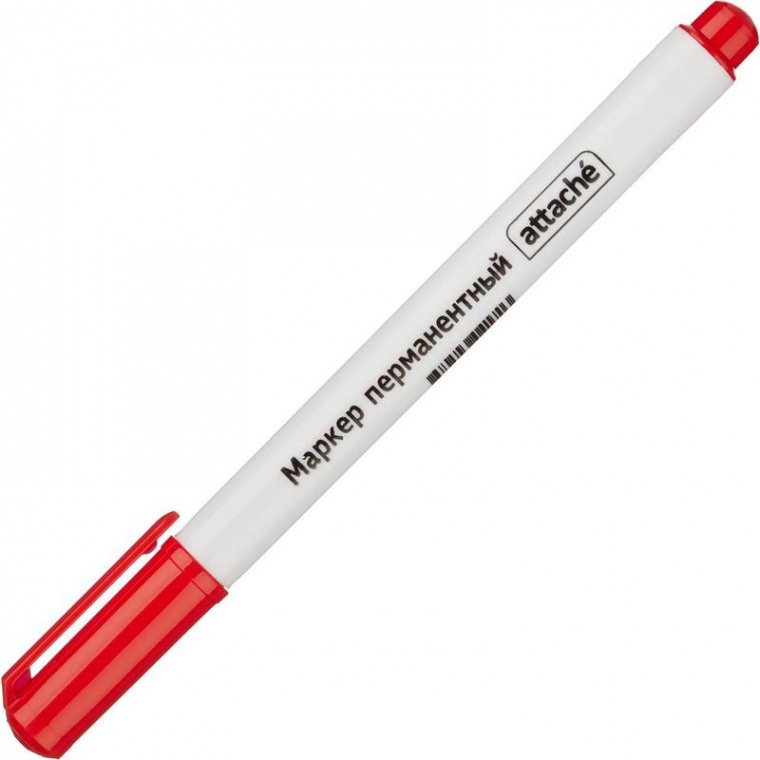 Перманентный маркер Attache в корпусе из прочного пластика. Нестираемые чернила пишут на любой поверхности. Игольчатый наконечник позволяет провести тонкую линию толщиной 0,5 мм. Цвет — красный.