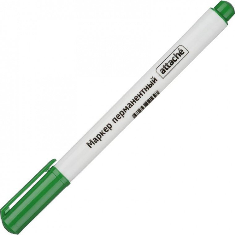 Перманентный маркер Attache в корпусе из прочного пластика. Нестираемые чернила пишут на любой поверхности. Игольчатый наконечник позволяет провести тонкую линию толщиной 0,5 мм. Цвет — зеленый.