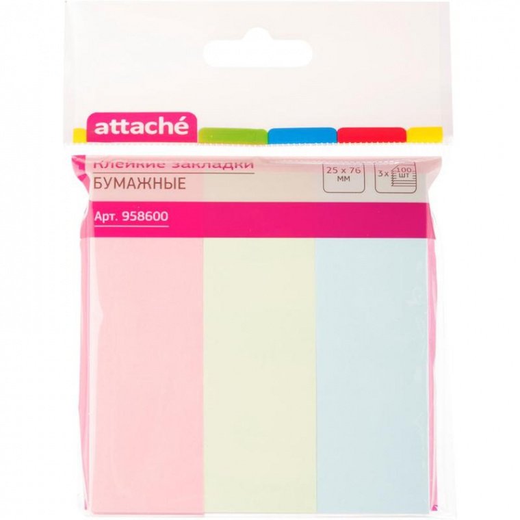 Бумажные клейкие закладки Attache. В упаковке 3 пастельных цвета по 100 листов каждого. Ширина закладки составляет 25 мм. Закладки позволяют выделить и систематизировать нужную информацию в документах, используются для записи краткой информации. Клейкие закладки легко удаляются, не оставляя следов и не повреждая бумагу.