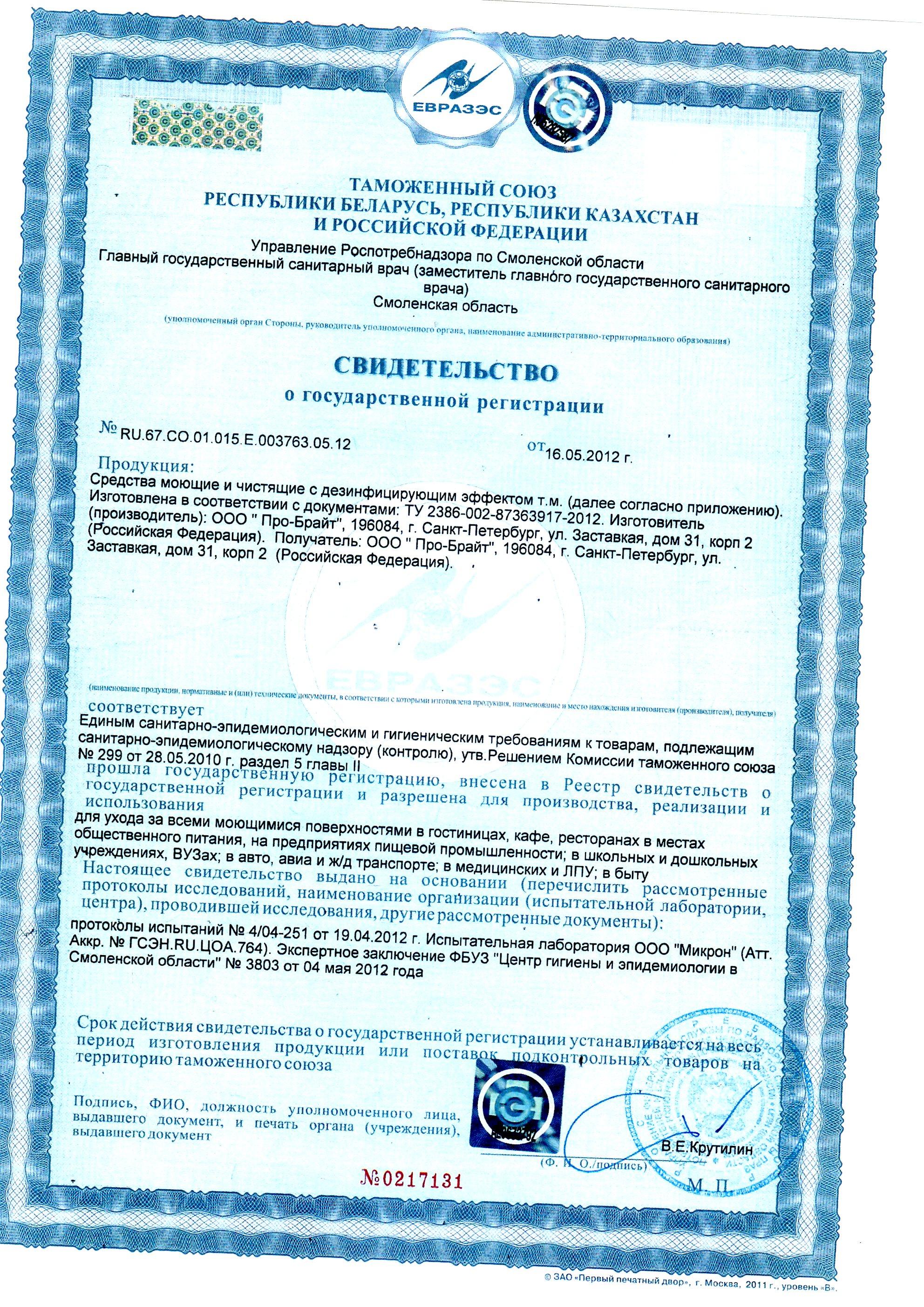 Сертификат на товар - Моющее средство для осветления посуды Pro-Brite Bel 5 л (концентрат)