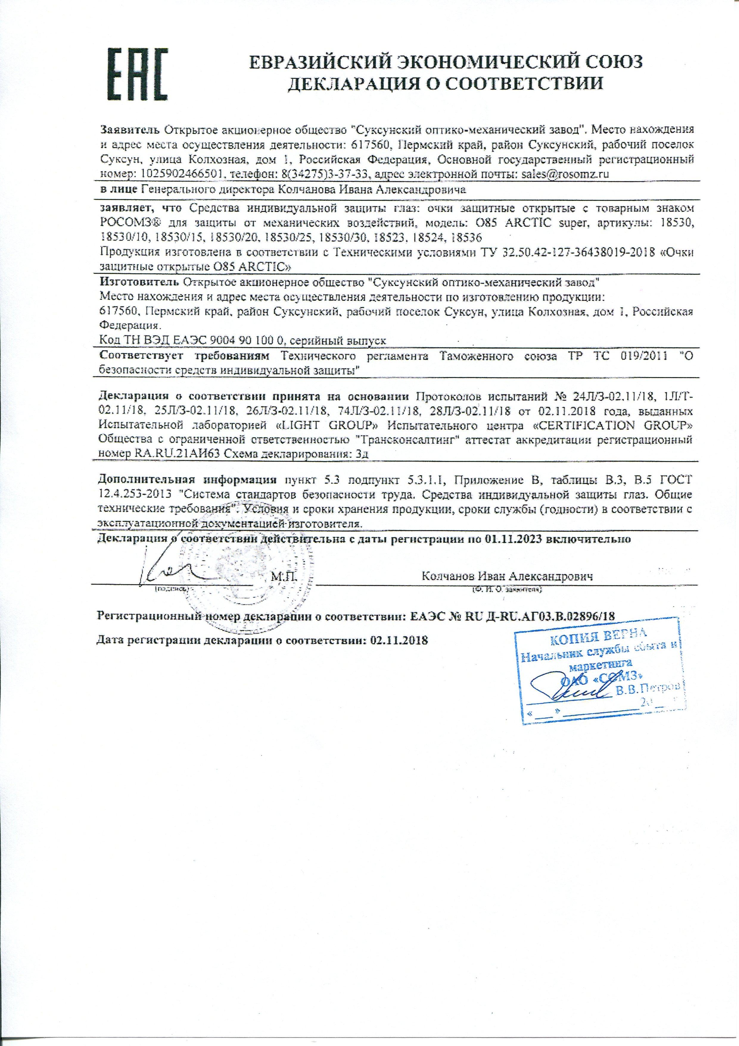 Сертификат на товар - Очки защитные открытые универсальные РОСОМЗ О85 Arctic прозрачные (18530)