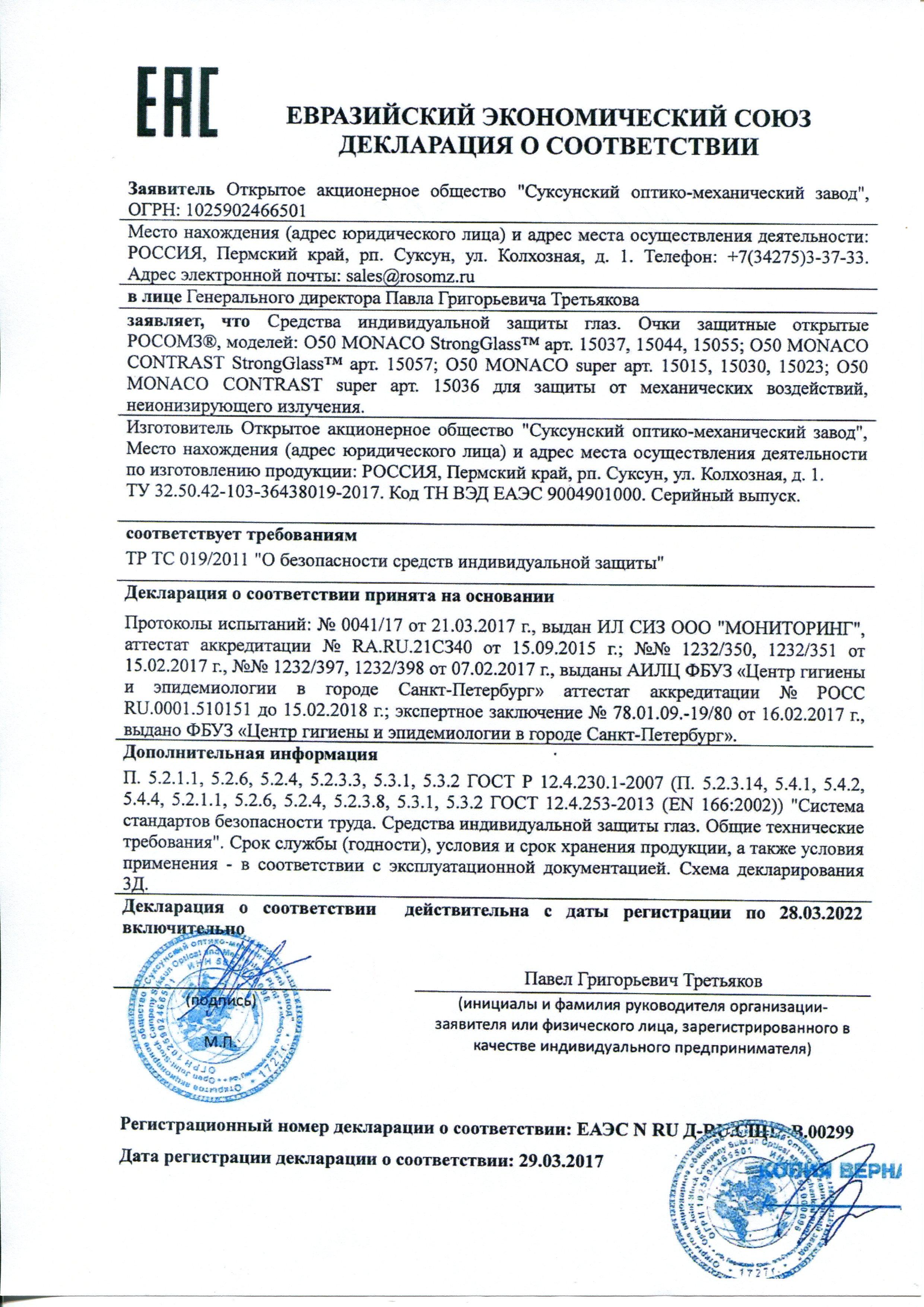 Сертификат на товар - Очки защитные открытые универсальные РОСОМЗ О50 Monaco зеркальные (15015)
