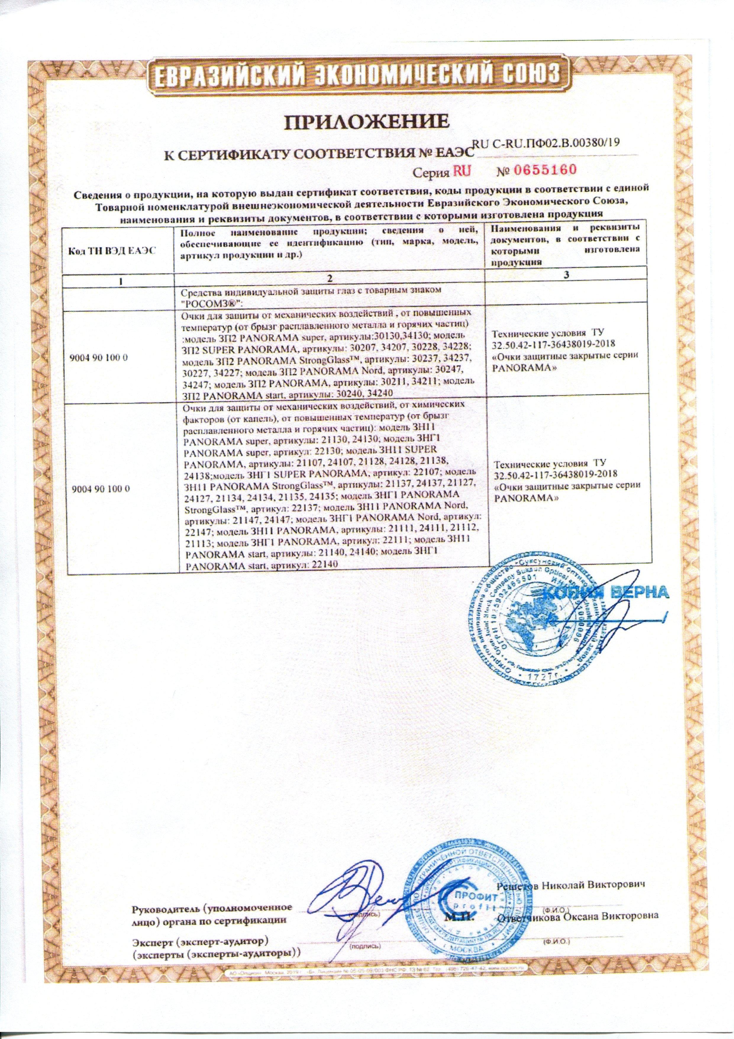 Сертификат на товар - Очки защитные закрытые универсальные РОСОМЗ ЗН11 Super Panorama прозрачные (21107)