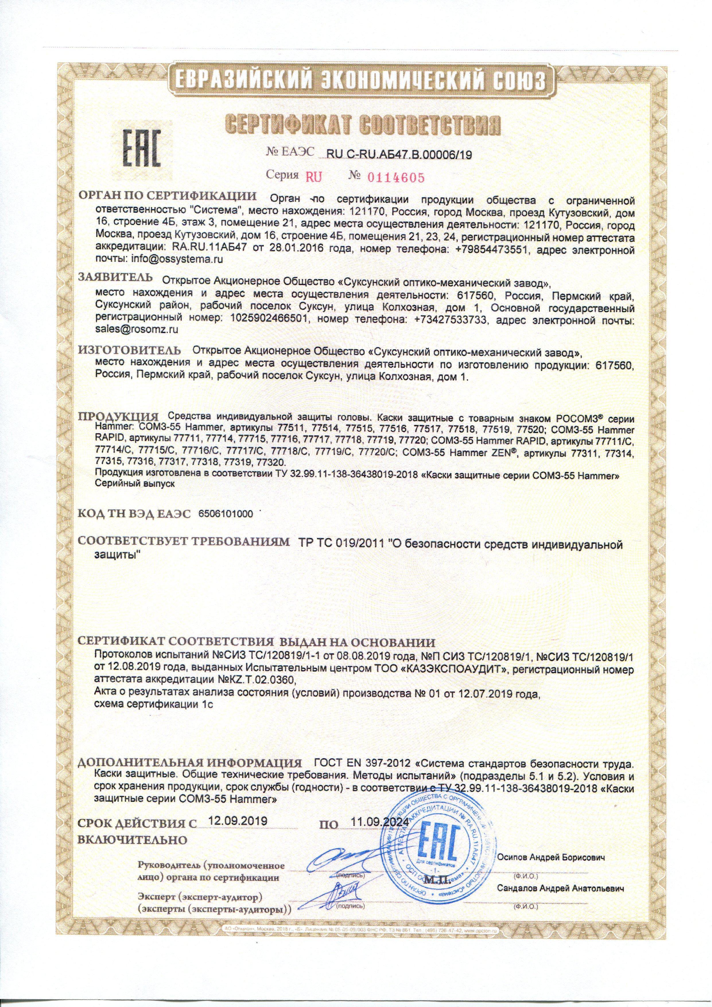 Сертификат на товар - Каска Росомз Hammer оранжевая (артикул производителя 77514)