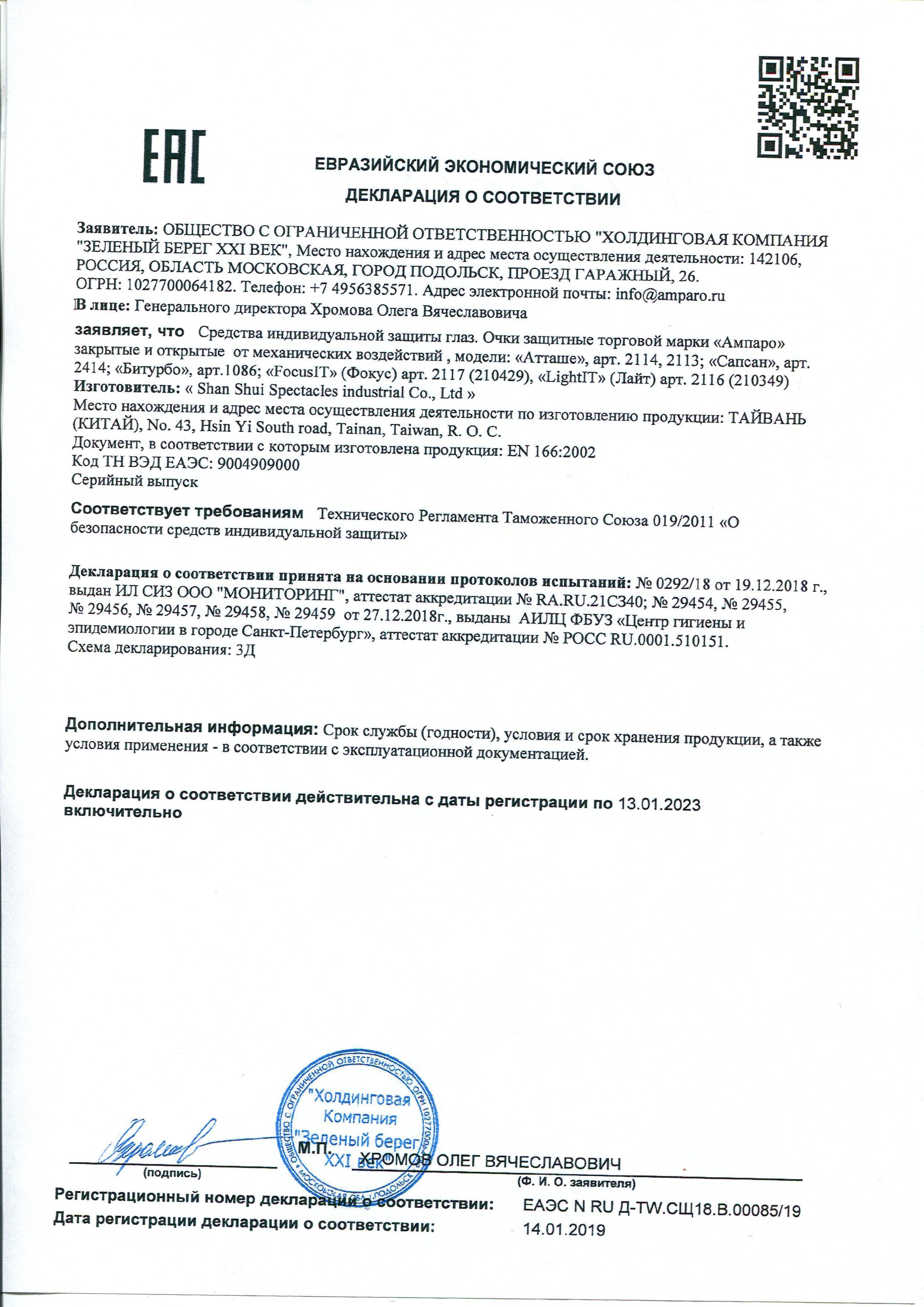 Сертификат на товар - Очки защитные открытые Ампаро Атташе прозрачные (артикул производителя 2114)