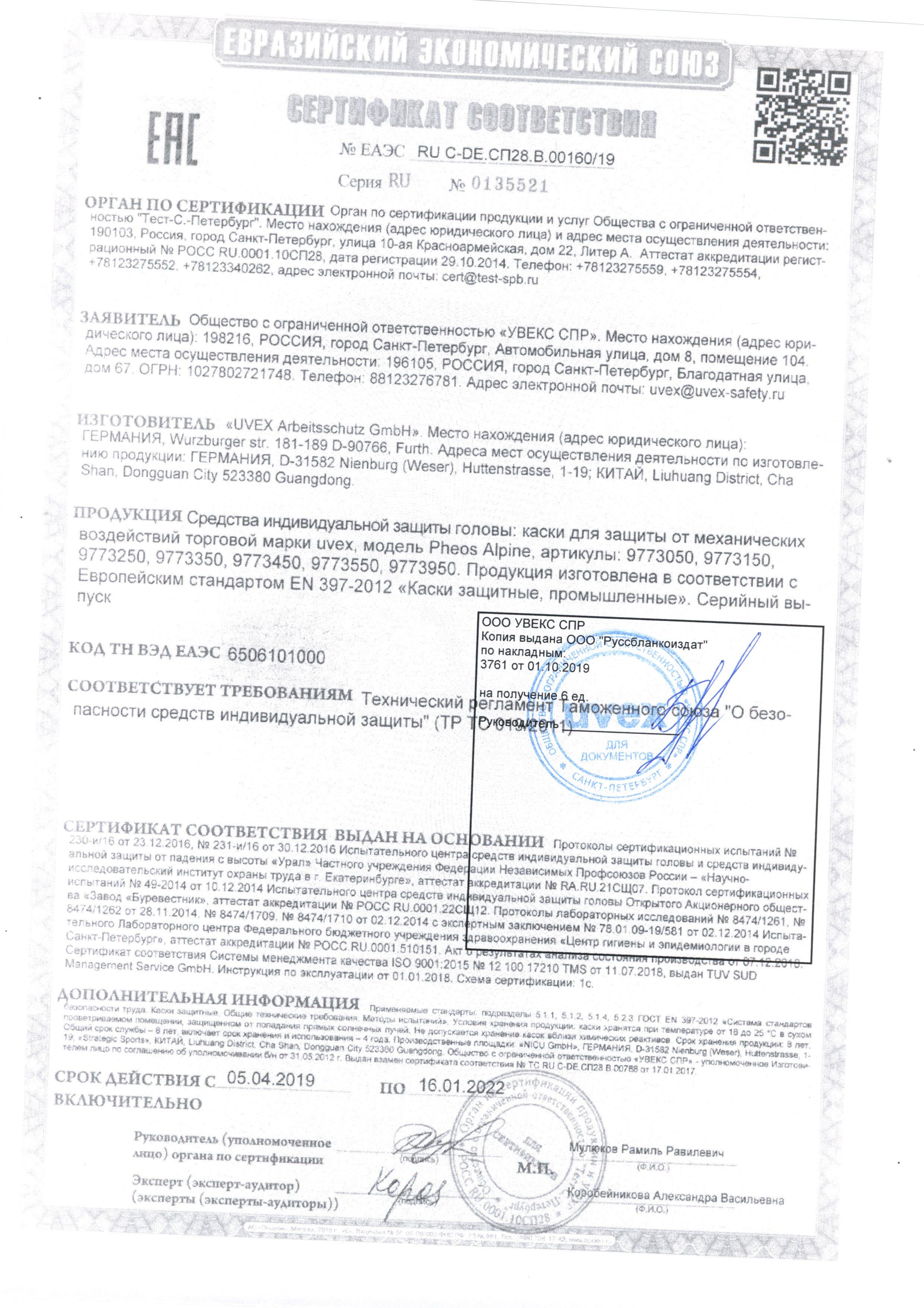 Сертификат на товар - Каска Uvex Феос Алпайн с храповиком желтая (артикул производителя 9773.150)