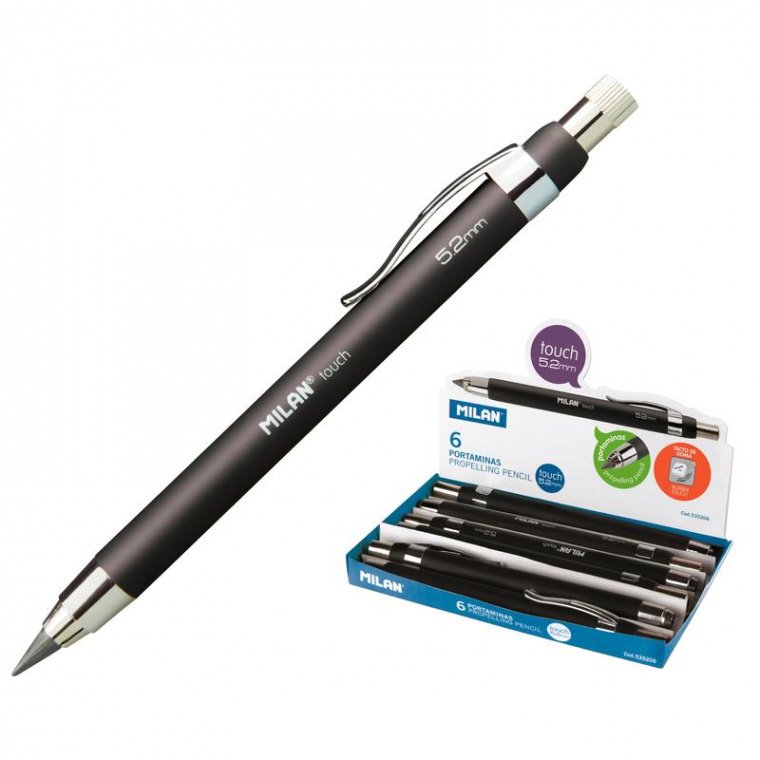 Карандаш механический Milan цанговый для профессионального использования. В комплекте два грифеля длиной 6 см. Толщина грифеля 5,2 мм, твердость B. Отличный пишущий инструмент для учебы и работы в офисе.