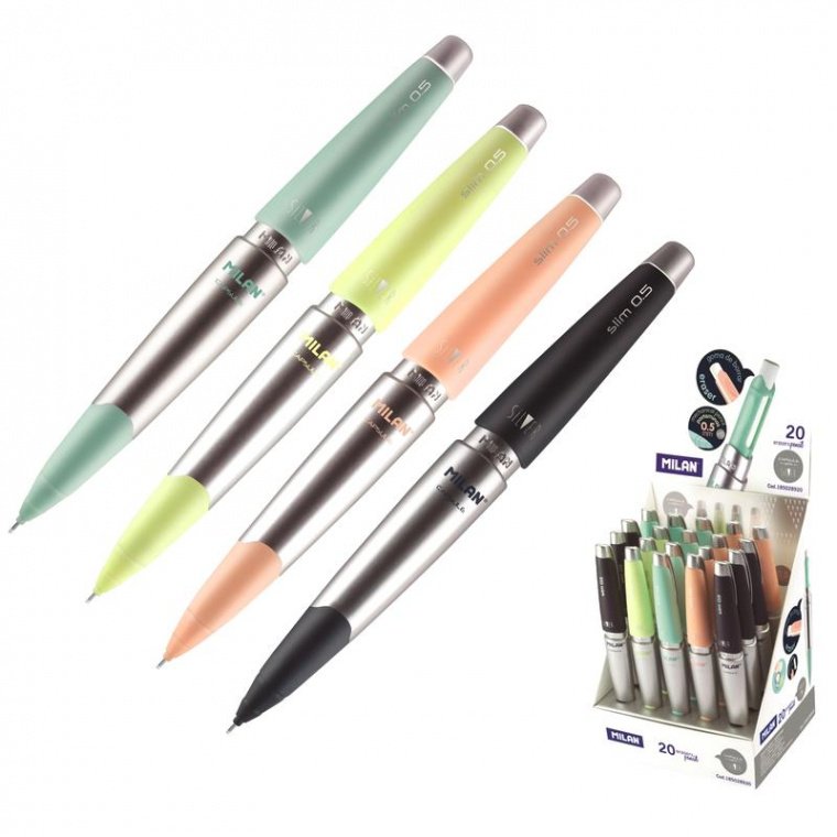 Карандаш механический Milan с оригинальном корпусом с выкручивающимся достаточно длинным ластиком, коллекция Capsule Silver Slim. Цвет металик средней части корпуса в сочетании с темно-синим , желтым, салатовым и розовым цветом нижней и верхней части . Толщина грифеля 0,5 мм , твердость HB. Размеры : 13×1,4×1,2 см. Доступны сменные грифели.