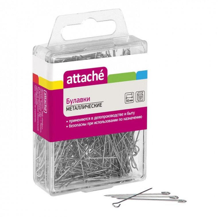 Металлические булавки Attache серебристого цвета имеют длину 30 мм. Используются для скрепления документов и для прикрепления объявлений на пробковые доски. В пластиковой упаковке с европодвесом 500 булавок.