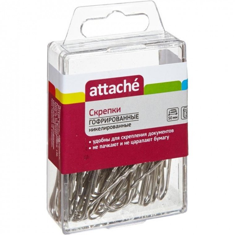 Скрепки Attache изготовлены из металла, никелированные. Имеют гофрированную поверхность и удобную закругленную форму, что позволяет надежно скреплять документы. Размер одной скрепки — 50 мм, 30 штук в пластиковой упаковке с европодвесом. Количество упаковок в коробке: 80 упаковок по 30 штук.