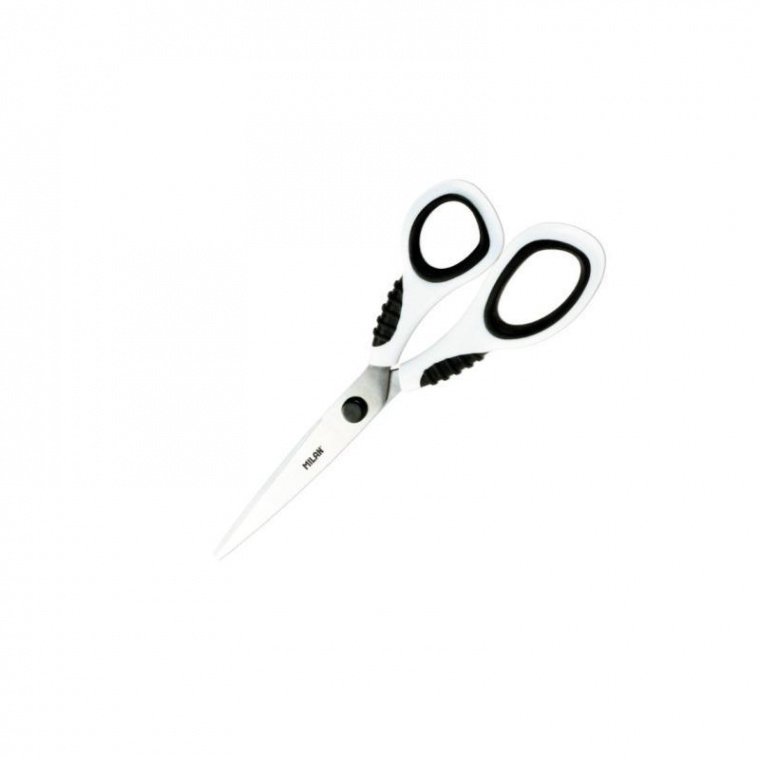 Канцелярские (офисные) ножницы Milan с ударопрочными лезвиями из нержавеющей стали. Белые эргономичные ручки с черными прорезиненными вставками предотвращают скольжение пальцев. Двухсторонняя заточка лезвий. Длина — 20,5 см. Поставляются в блистере.