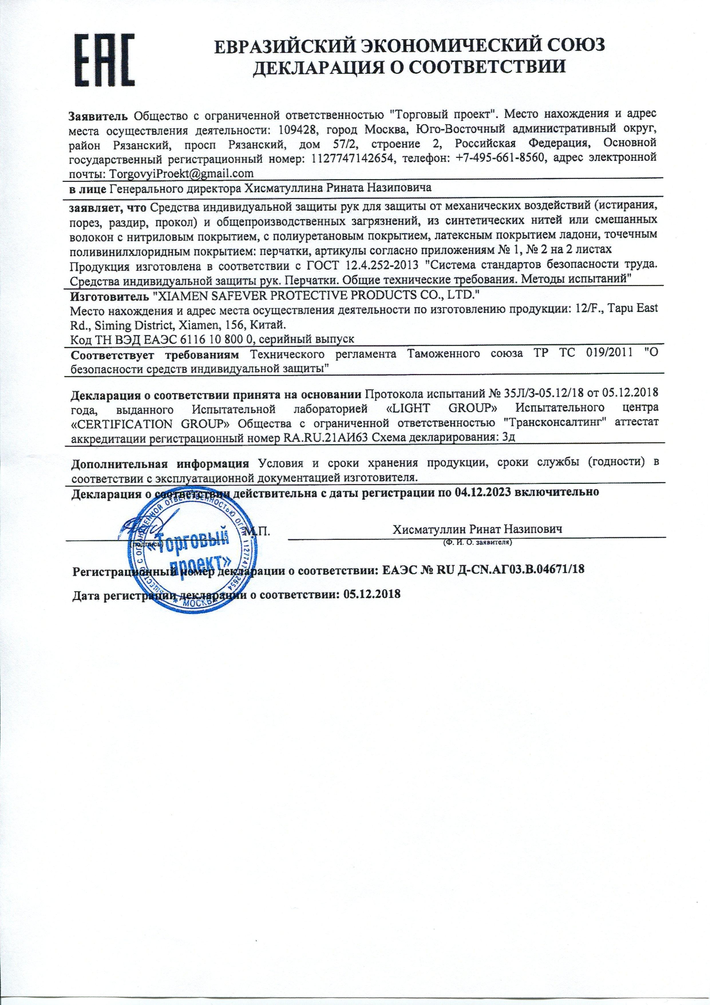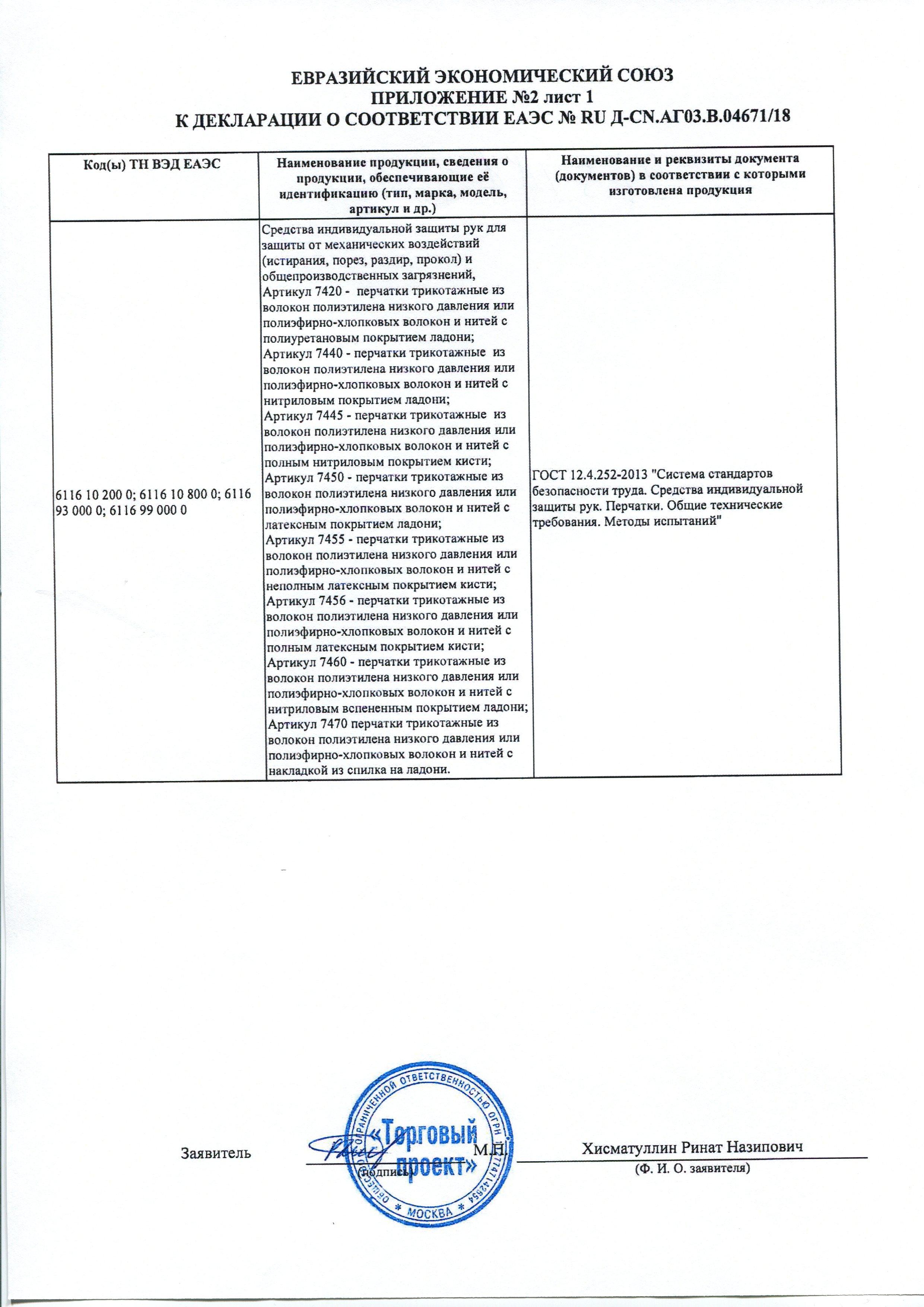 Сертификат на товар - Перчатки защитные нейлоновые размер 10