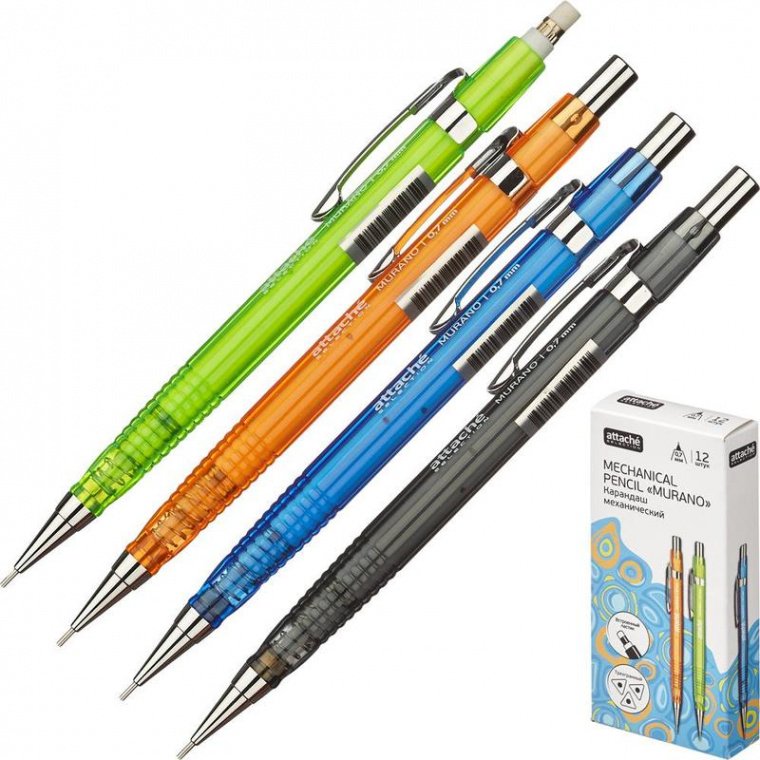 Карандаш механический Attache Selection Murano с толщиной линии письма 0,7 мм. Выполнен в прозрачном тонированном пластиковом корпусе, цвет корпуса — в ассортименте. Карандаш механический обладает металлическим наконечником, клипом и ластиком. Предназначен для рисования, черчения и письма. Сменный стержень для механического карандаша вы сможете найти во вкладке «Расходные материалы». Товар поставляется в нескольких вариантах цвета/дизайна (без возможности выбора).