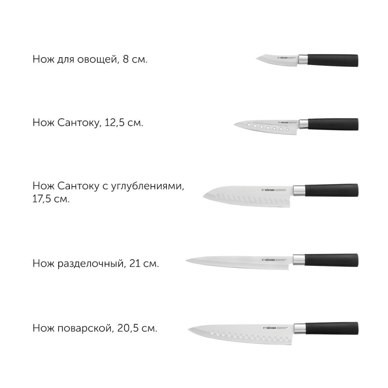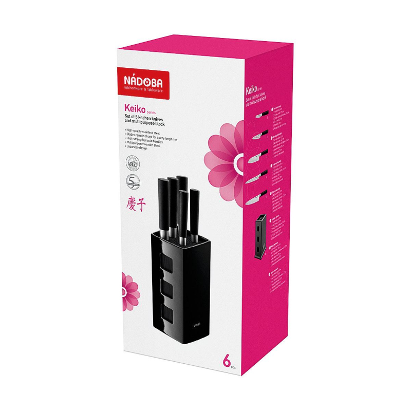 Набор кухонных ножей Nadoba Keiko состоит из 6 предметов: - поварской нож - универсальный нож - разделочный нож - сантоку - нож для чистки овощей - блок Острые лезвия (длина варьируется от 8 до 21 см) выполнены из высококачественной нержавеющей стали премиум-класса толщиной от 2 мм до 2,5 мм. Ручки ножей выполнены из высокопрочного пластика и нержавеющей стали. Керамический блок набора является блоком нового поколения. Он позволяет хранить ножи в различном количестве и в произвольном порядке. Пластиковые волокна не тупят ножи и легко моются. Набор с современным минималистичным дизайном прекрасно впишется в интерьер любой кухни, сохраняя остроту лезвий в течение долгого времени. Размер упаковки 36x16x13 см.