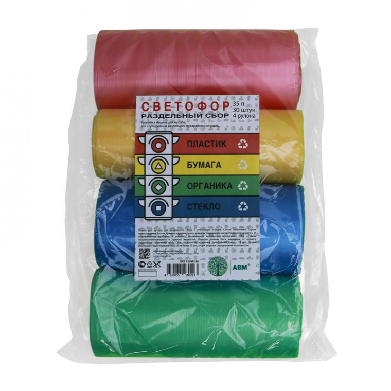 Мешки для мусора на 35 литров Светофор в ассортименте (8 мкм, в рулоне 30 штук, в упаковке 4 рулона, 48×58 см)