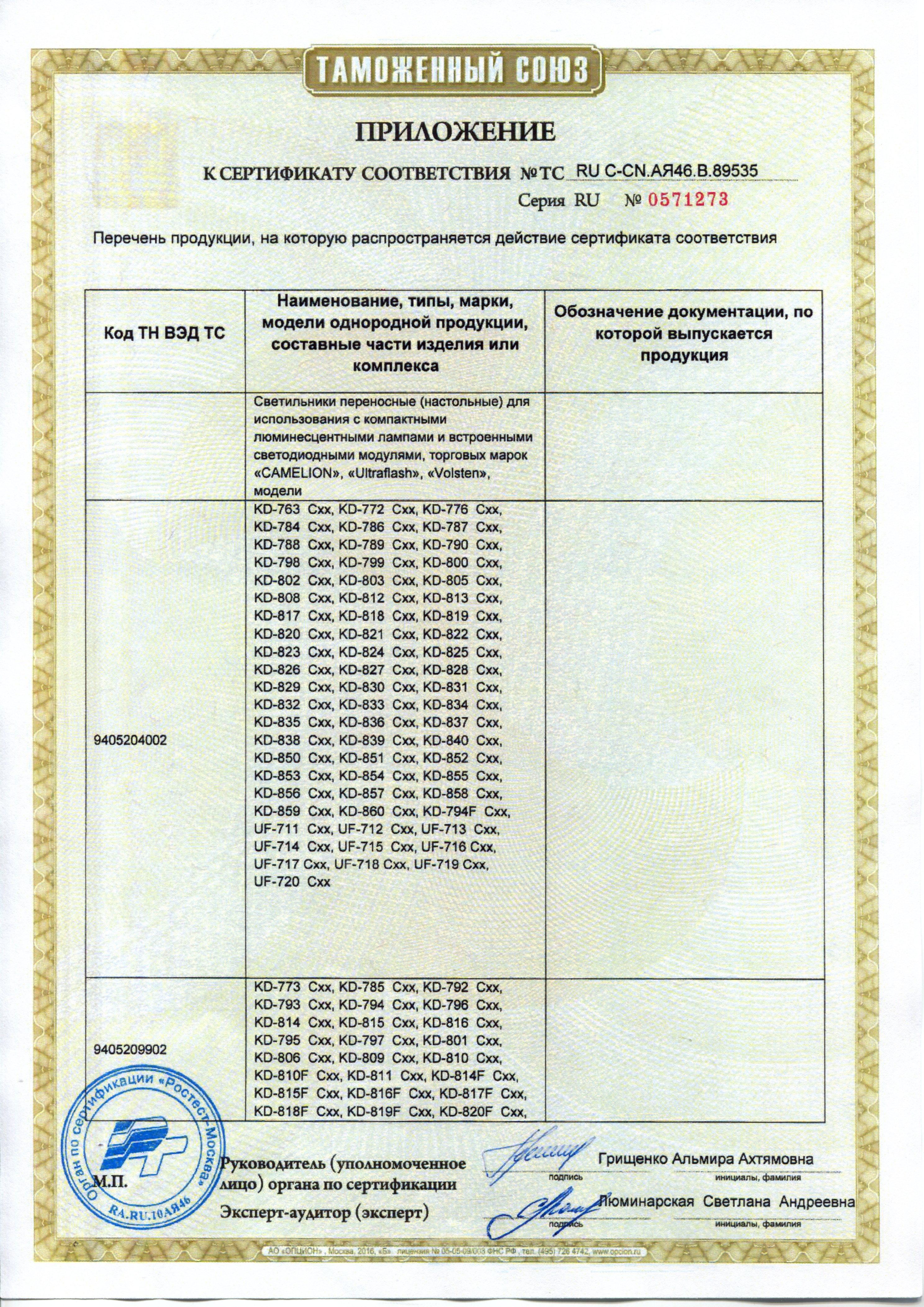 Сертификат на товар - Светильник Camelion KD-821 C03 серебристый