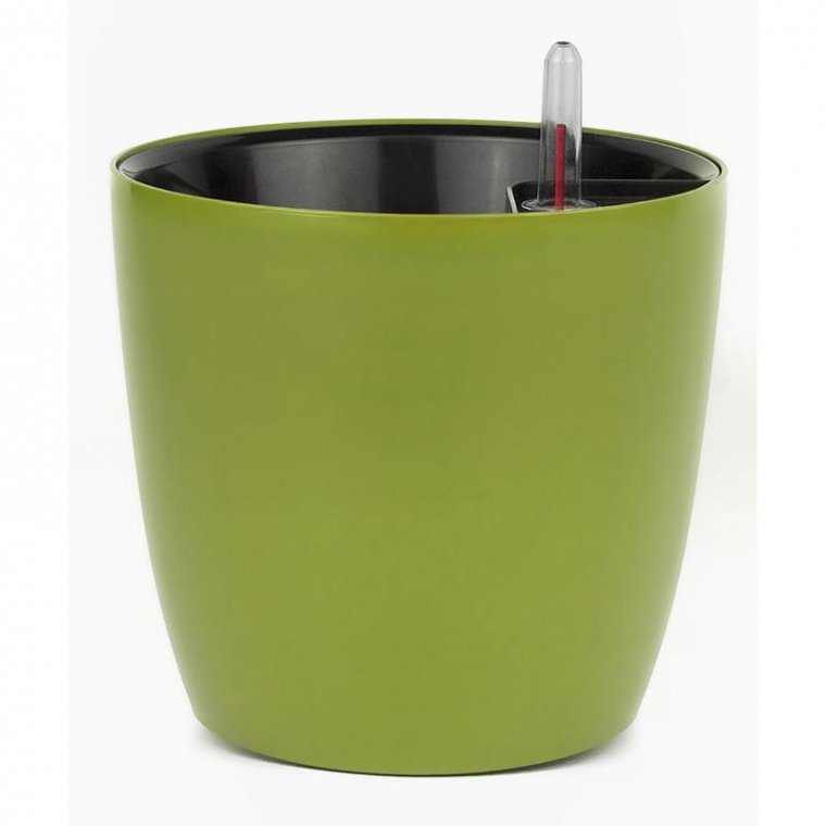 Горшок состоит из трех частей — внешнее кашпо, внутренняя часть и индикатор воды. Такая конструкция позволяет поливать растение 1 раз в 2-3 недели, что не приведет к переливу растения. Размер изделия: 17×16 см. Объем: 3,5 л.