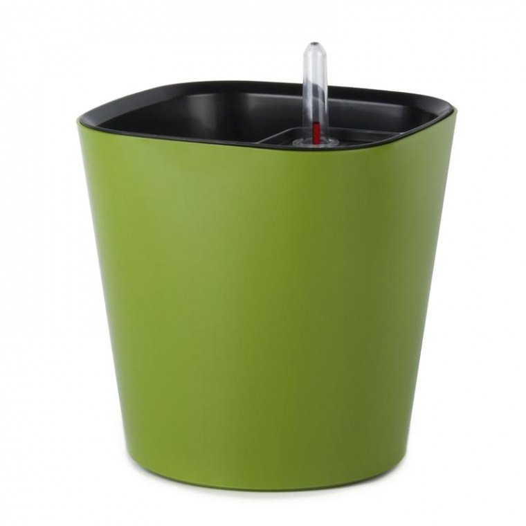 Горшок состоит из трех частей — внешнее кашпо, внутренняя часть и индикатор воды. Такая конструкция позволяет поливать растение 1 раз в 2-3 недели, что не приведет к переливу растения. Размер изделия: 17×16 см. Объем: 3 л.