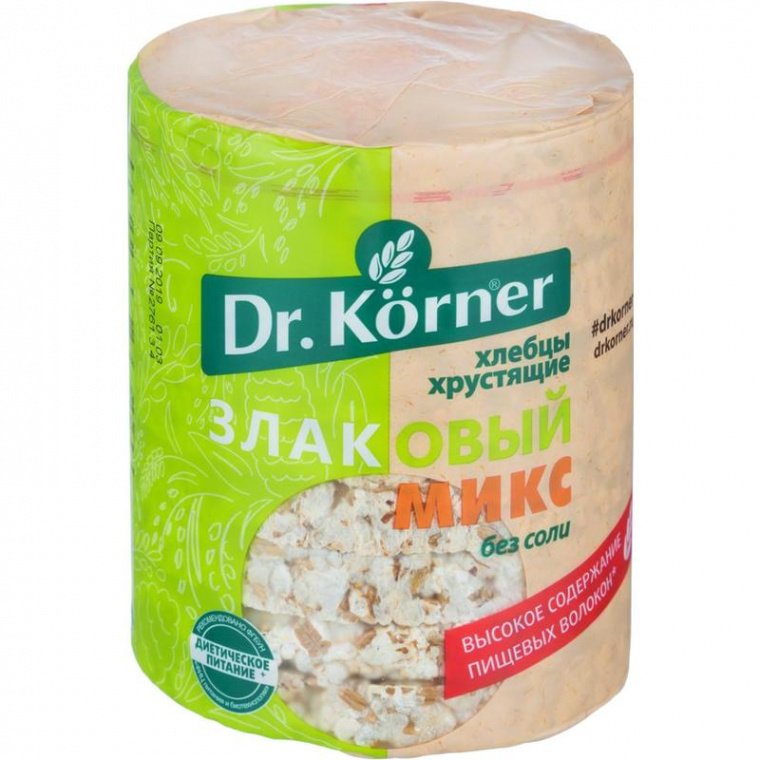 Хлебцы Dr. Korner «Злаковый микс без соли» пшеничные станут отличным помощником для людей, следящих за своим здоровьем, внешним видом или придерживающихся диеты. Хлебцы изготавливаются из цельных зерен злаковых культур, в них сохранены ценные витамины и пищевые волокна. Их регулярное употребление способствует очищению организма, поскольку хлебцы являются натуральным энтеросорбентом.