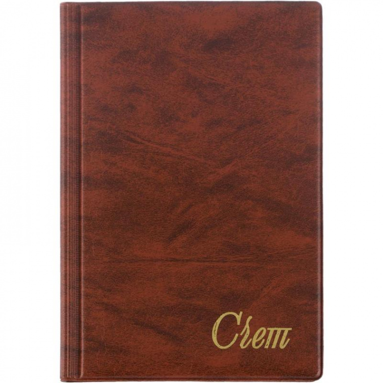 Папка для счета коричневого цвета. Размер: 125×190×10 мм. На обложке тиснение золотой фольгой «Счет», внутри карманы-уголки. Упаковка в термоусадочную пленку по 3 штуки. Страна происхождения: Россия.