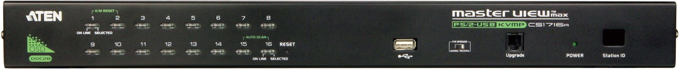 KVM-переключатель CS1716A – устройство управления несколькими компьютерами с одной PS/2 или USB консоли (клавиатура, монитор и мышь). Один переключатель CS1716A может управлять 16 компьютерами. Используя гирляндное подключение можно добавить 31 дополнительный переключатель, что позволяет управлять 512 компьютерами с одной консоли KVM (клавиатура, монитор и мышь). Кроме того, для каждого компьютера на передней панели имеется порт USB, позволяющий поочередно использовать любые подключенные к нему периферийные устройства.