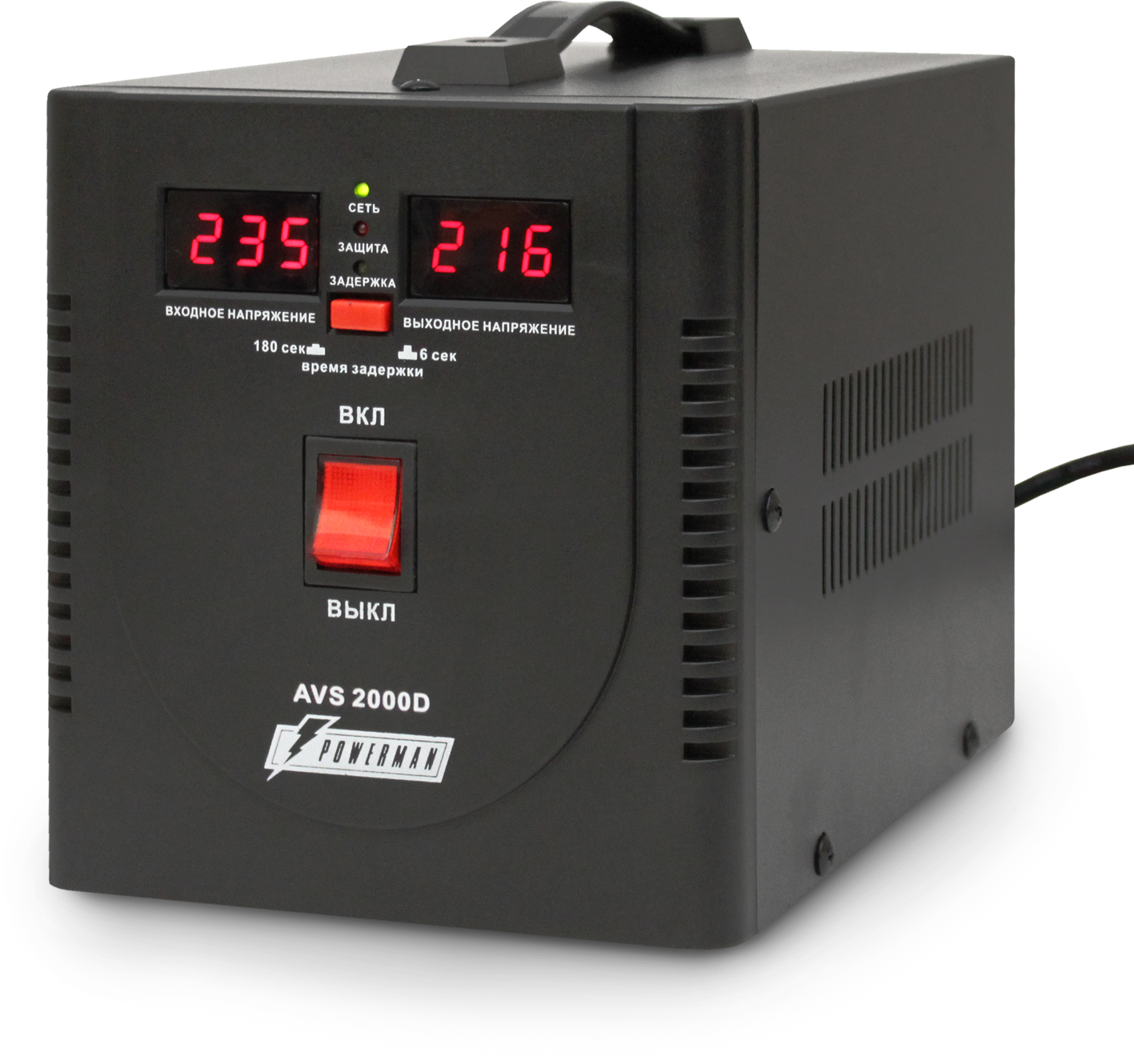 Стабилизатор POWERMAN AVS 2000D, черный, ступенчатый регулятор, цифровые индикаторы уровней напряжения, 2000ВА, 140-260В, максимальный входной ток 12А, 2 евророзетки, IP-20, напольный, 200мм х 160мм х 190мм, 4.9 кг./ Stabilizer POWERMAN AVS 2000D, black, step-type regulator, digital indicators of voltage levels, 2000VA, 140-260V, maximum input current 12A, 2 eurosockets, IP-20, floor standing, 200mm x 160mm x 190mm, 4.9kg.