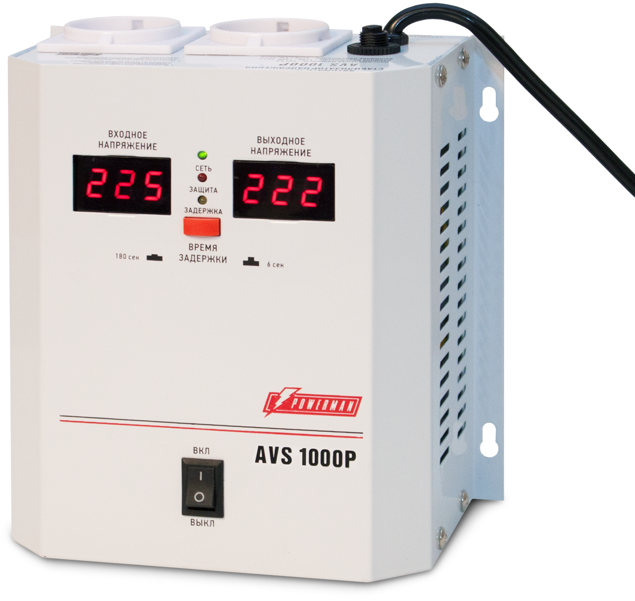 Стабилизатор POWERMAN AVS 1000P, ступенчатый регулятор, цифровые индикаторы уровней напряжения, 1000ВА, 110-260В, максимальный входной ток 7А, 2 евророзетки, IP-20, навесной, 185мм х 170мм х 100мм, 3.5 кг./ Stabilizer POWERMAN AVS 1000P, step-type regulator, digital indicators of voltage levels, 1000VA, 110-260V, maximum input current 7A, 2 eurosockets, IP-20, hinged, 185mm x 170mm x 100mm, 3.5 kg.