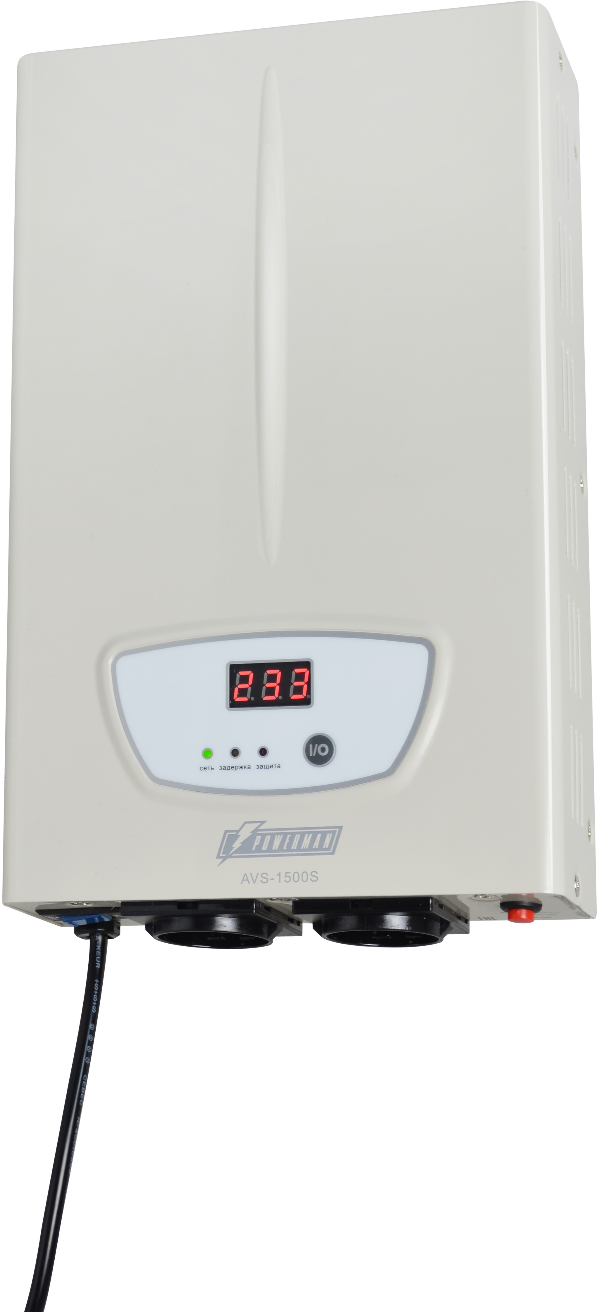 Стабилизатор POWERMAN AVS 1500S, ступенчатый регулятор, цифровые индикаторы уровней напряжения, 1500ВА, 140-260В, максимальный входной ток 12А, 2 евророзетки, IP-20, навесного исполнения, 310мм х 200мм х 68мм, 4,36 кг./ Stabilizer POWERMAN AVS 1500S, step-type regulator, digital indicators of voltage levels, 1500VA, 140-260V, maximum input current 12A, 2 eurosockets, IP-20, mounted version, 310mm x 200mm x 68mm, 4.36 kg.
