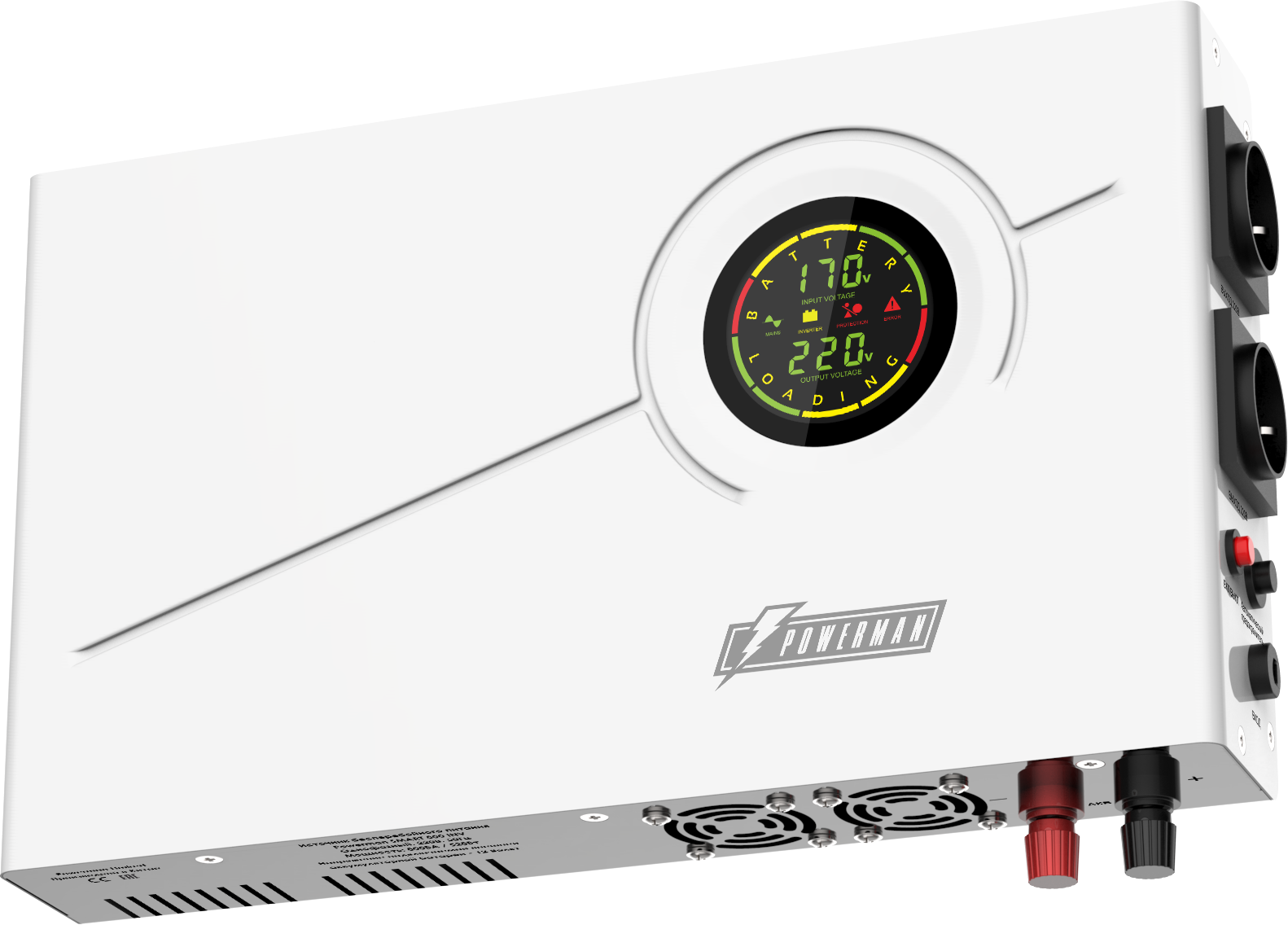 ИБП POWERMAN Smart 800 INV, линейно-интерактивный, 800ВА/528Вт, 140-275В, 2 евророзетки, внешняя батарея 12В от 45Ач до 200Ач (не входит в комплект поставки), ток заряда 13А, ЖК-дисплей, навесной, 410мм х 268мм х 70мм, 8.98 кг./ UPS POWERMAN Smart 800 INV, linear-interactive, 800VA/528W, 140-275V, 2 eurosockets, external battery 12V from 45Ah to 200Ah (not included in delivery), charging current 13A, LCD display, hinged, 410mm x 268mm x 70mm, 8.98 kg.
