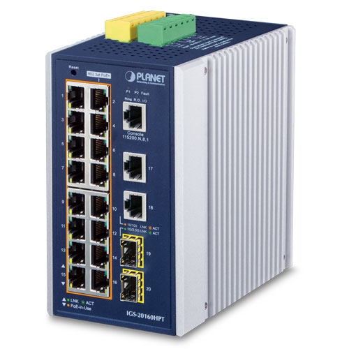коммутатор/ PLANET IP30 Industrial L2+/L4 16-Port 1000T 802.3at PoE+ 2-Port 1000T + 2-port 100/1000X SFP Full Managed Switch (-40 to 75 C, dual redundant power input on 48~56VDC terminal block, DIDO, ERPS Ring Supported, 1588)