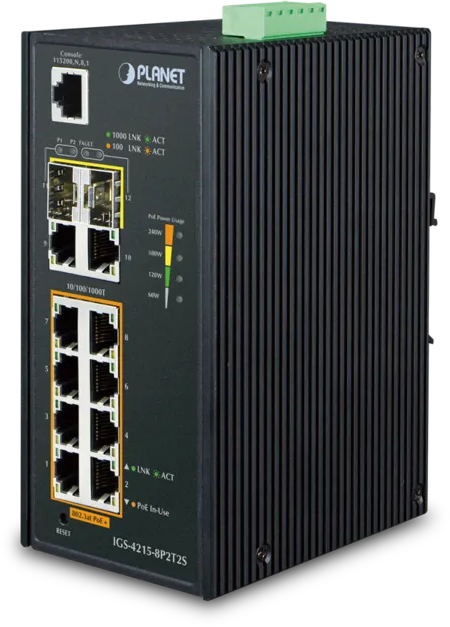 коммутатор/ PLANET IP30 Industrial L2/L4 8-Port 10/100/1000T 802.3at PoE + 2-Port 10/100/100T + 2-Port 100/1000X SFP Managed Switch (-40~75 degrees C), dual redundant power input on 48~56VDC terminal block, SNMPv3, 802.1Q VLAN, IGMP Snooping, SSL, SSH, ACL